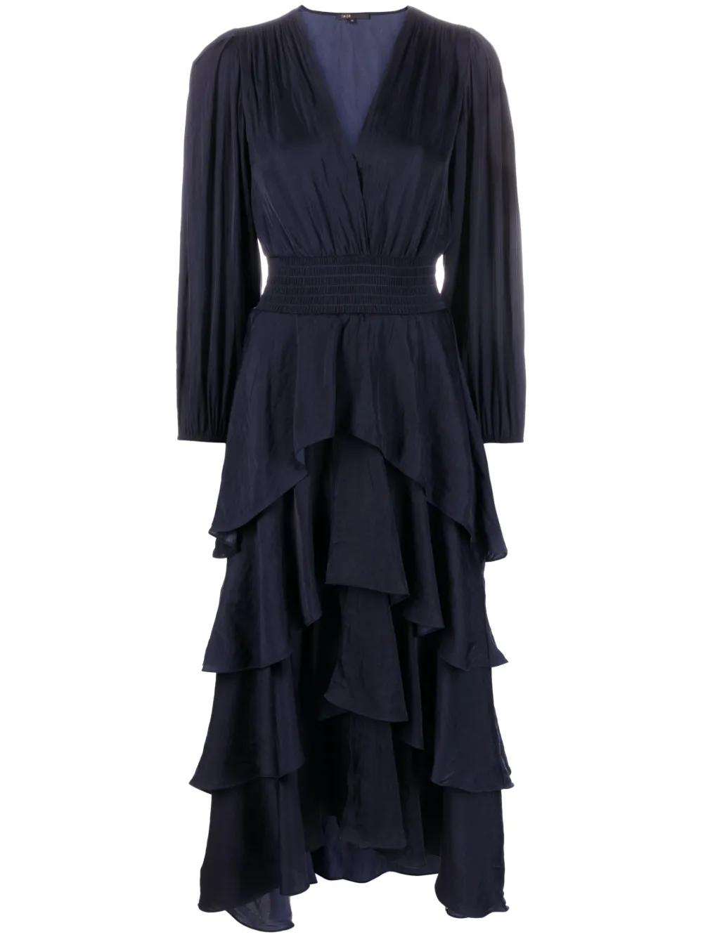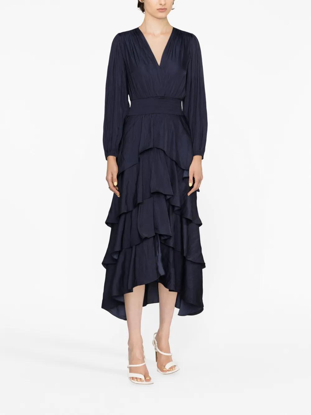 navy blue V-neck shirred panel long sleeves tiered skirt asymmetric hem mid-length
