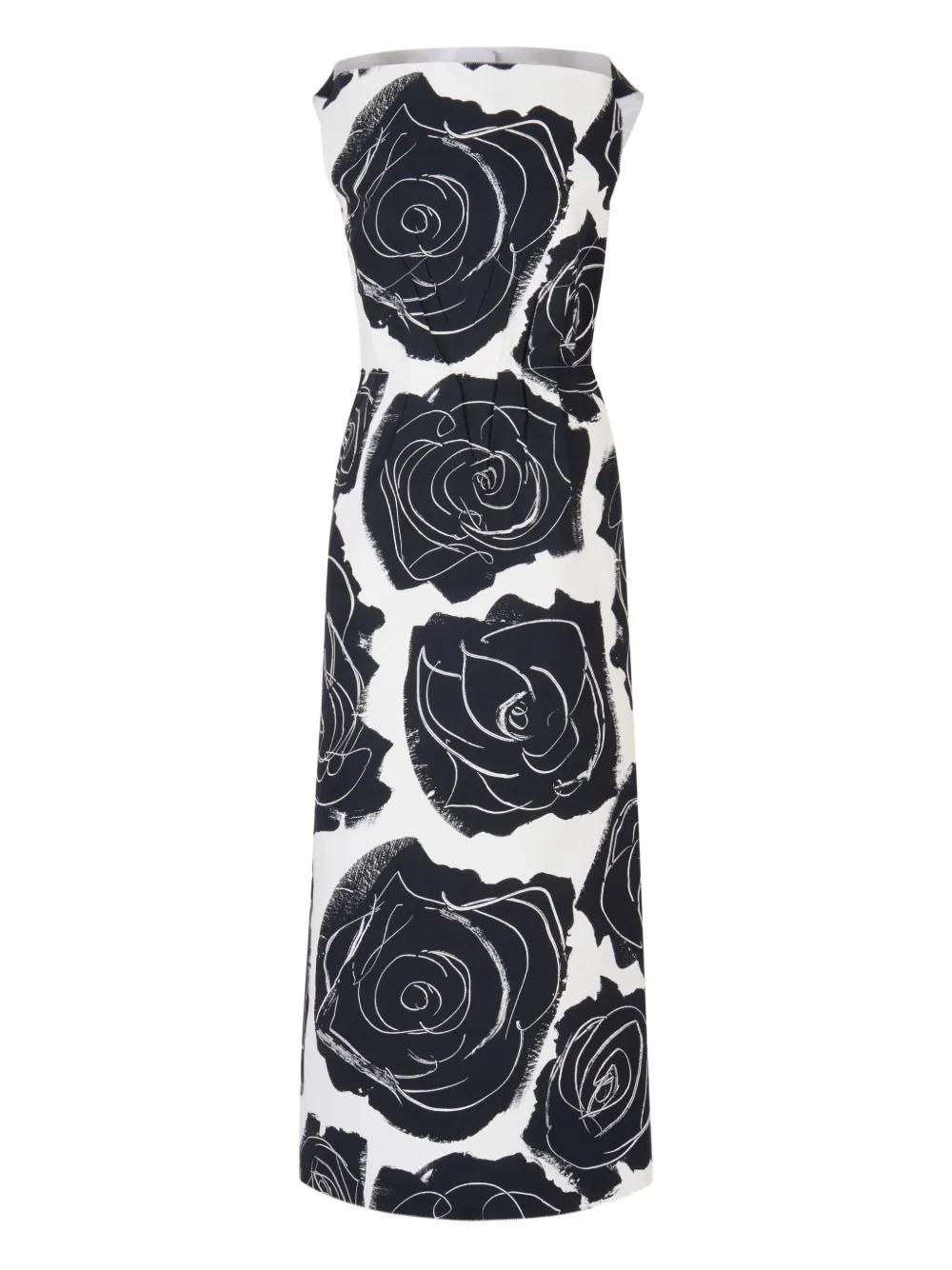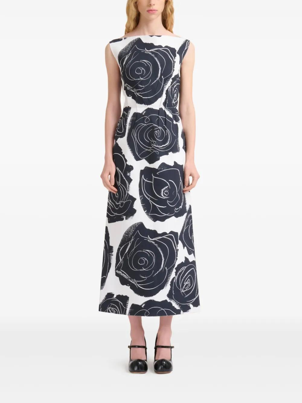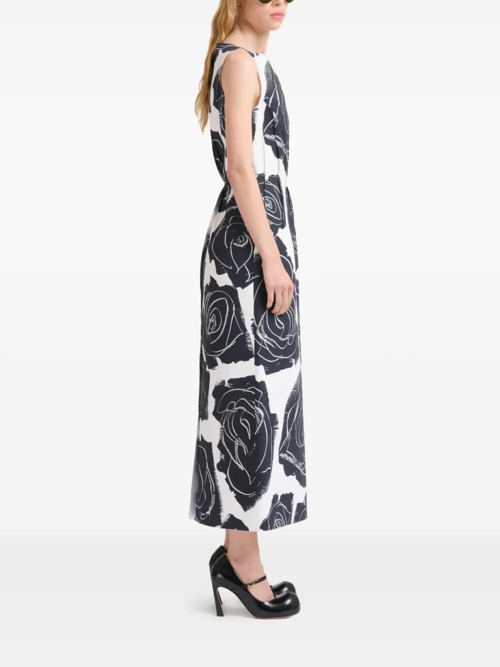 white floral design black rose motifs sleeveless slash neck cinched waistline flowing skirt