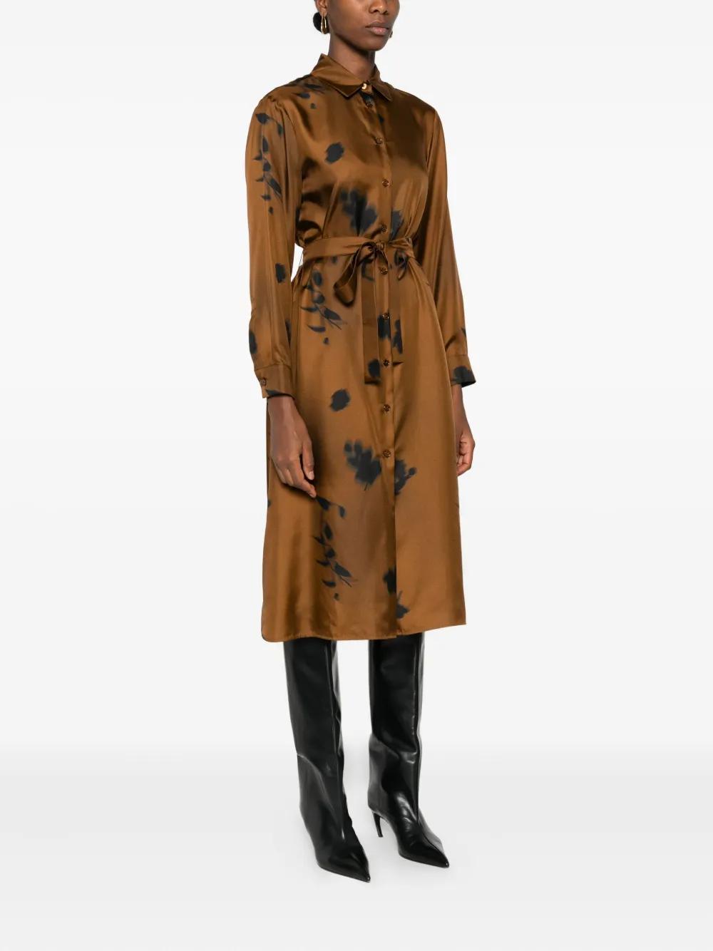 brown silk floral print front button fastening collared neckline self-tie belt long sleeves