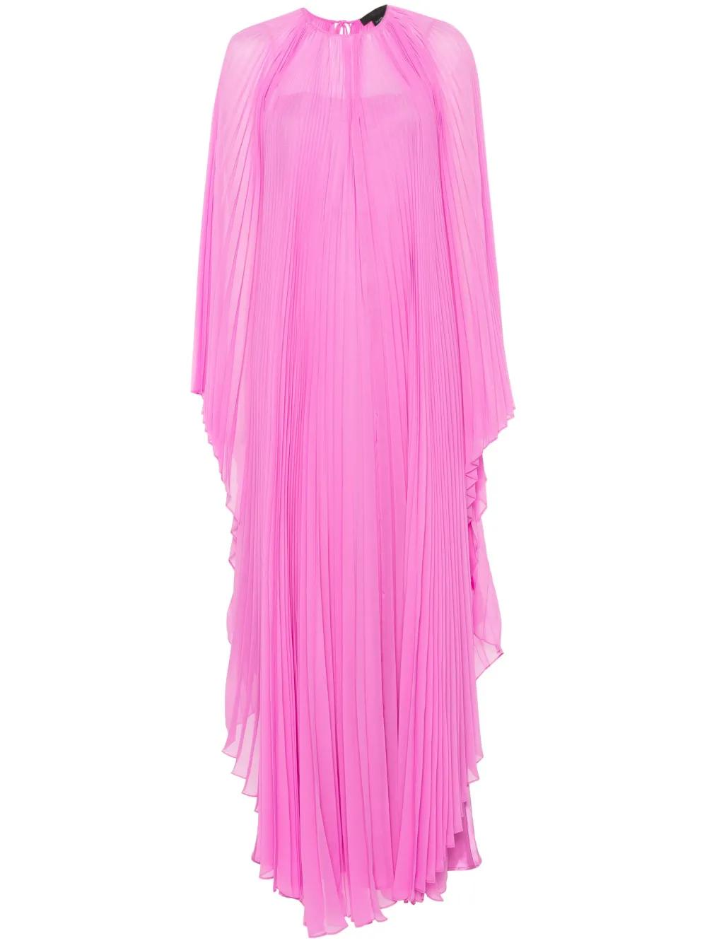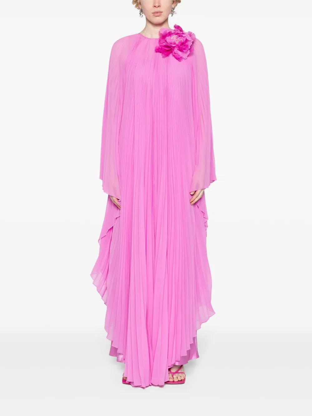 fuchsia pink chiffon fully pleated draped design kaftan silhouette round neck floral appliqué long raglan sleeves keyhole detail to the rear ankle-length internal slip dress self-tie fastening