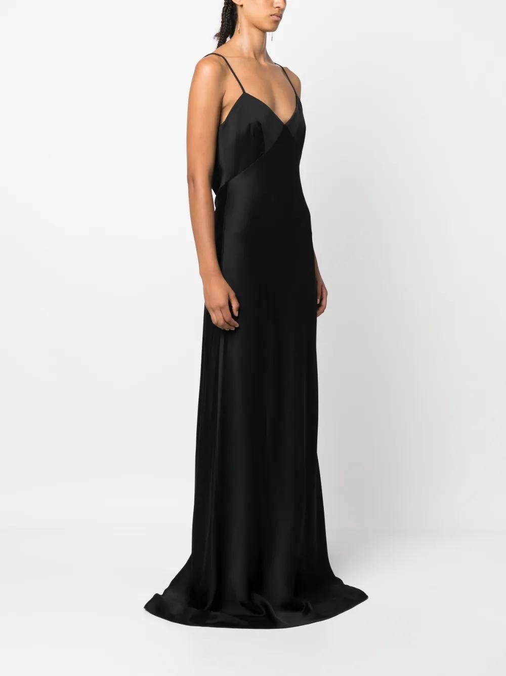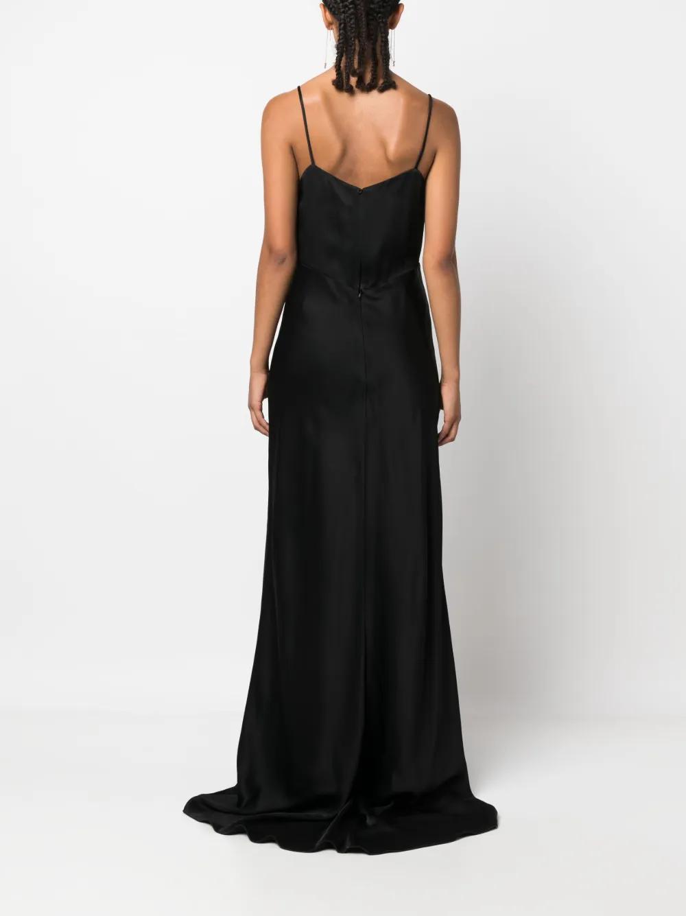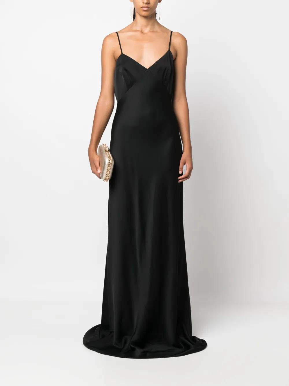 black satin weave V-neck spaghetti straps bustier-style neckline dart detailing flared skirt fabric-covered rear button fastening concealed rear zip fastening floor-length high-low hem