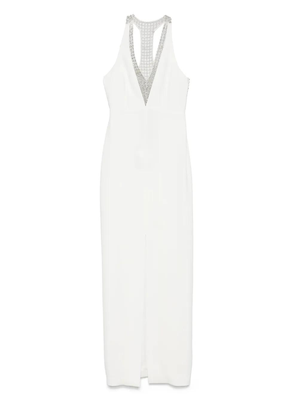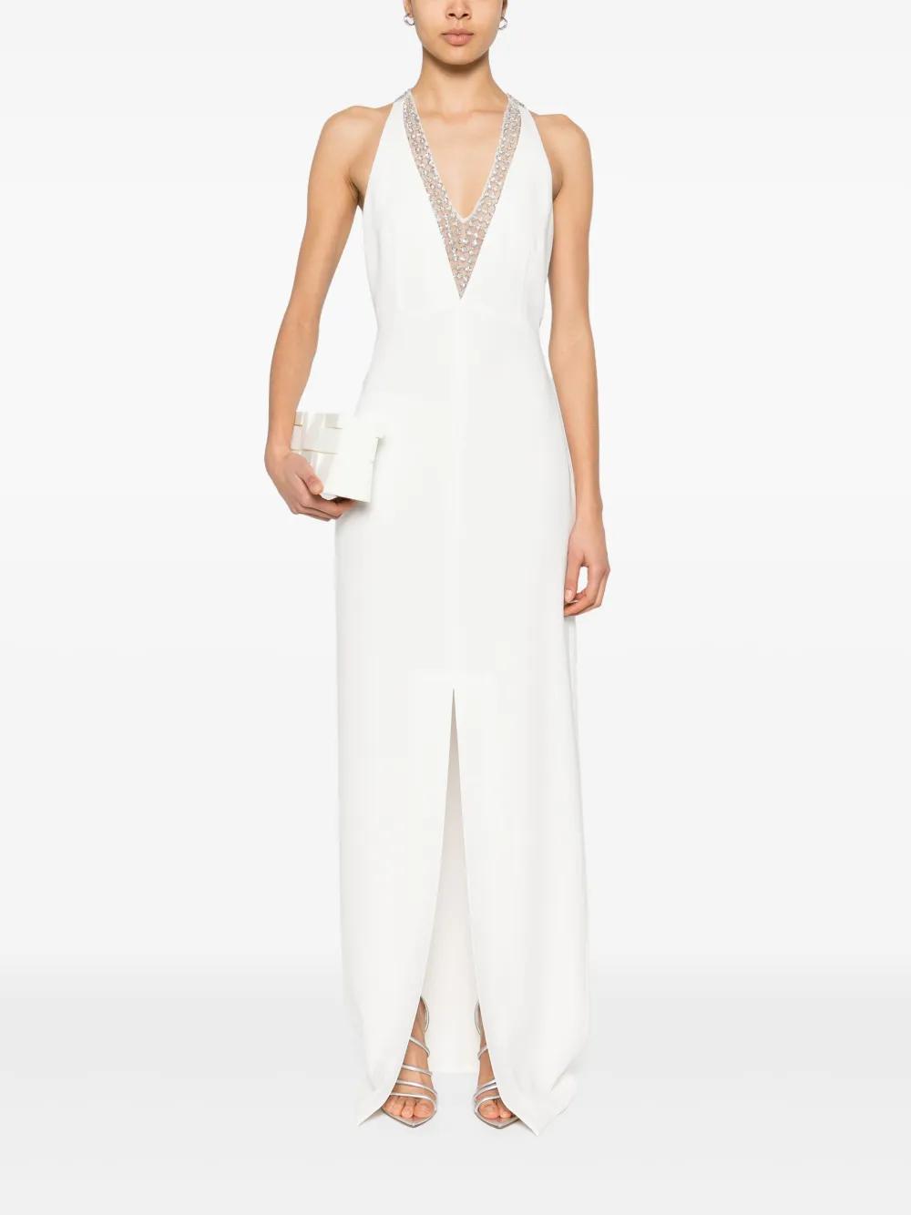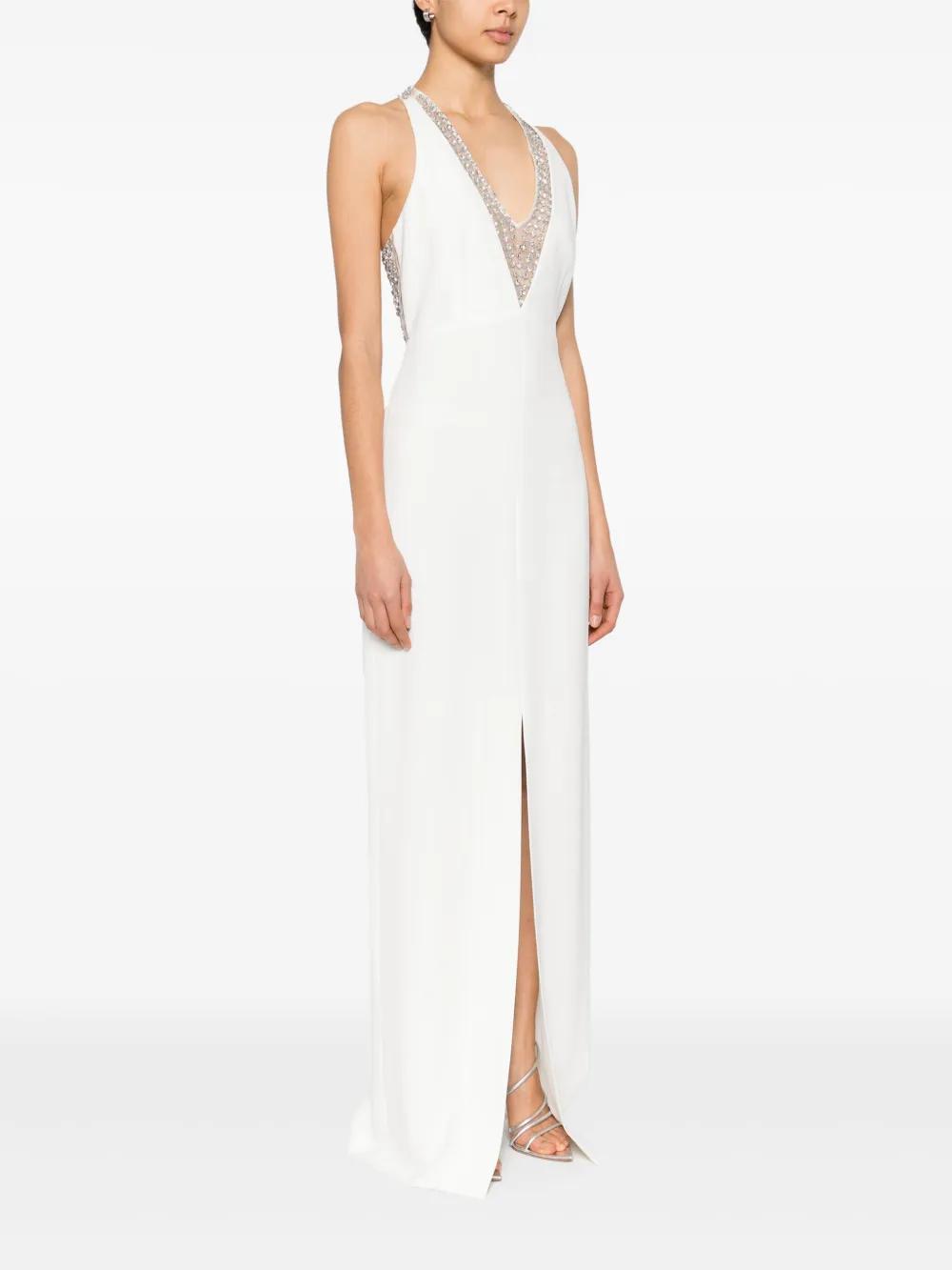 white concealed side hook and zip fastening front slit V-neck sequin embellishment