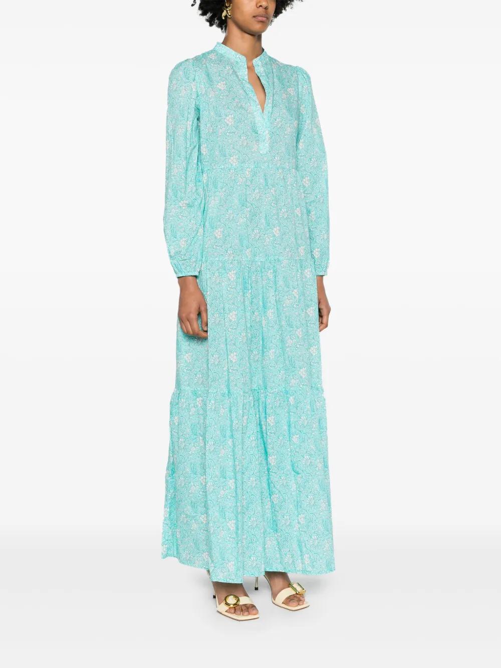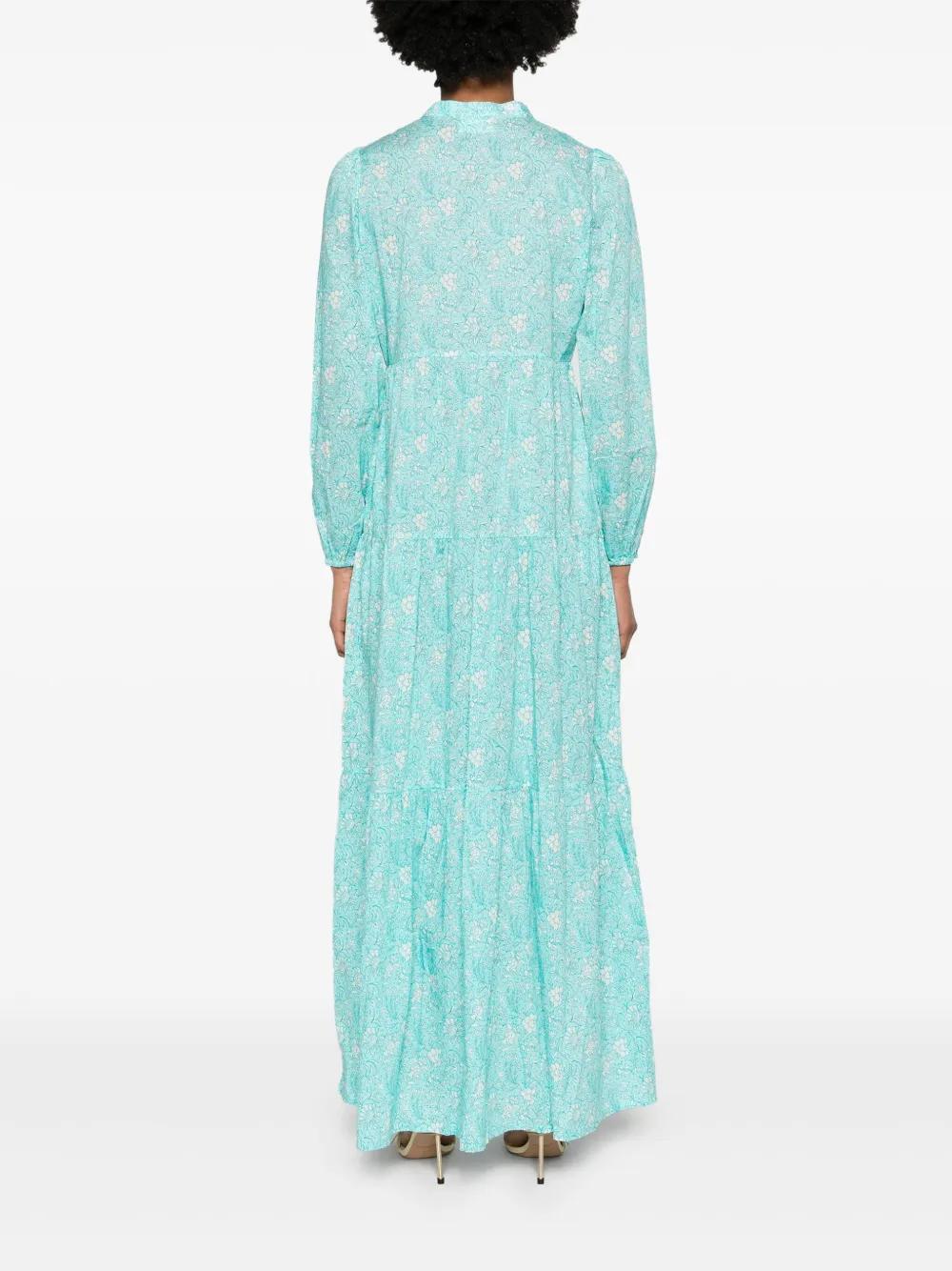 aqua blue/white cotton botanical print gathered detailing round split neck long sleeves elasticated cuffs fitted waistline tiered skirt unlined straight hem maxi