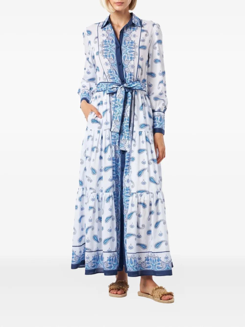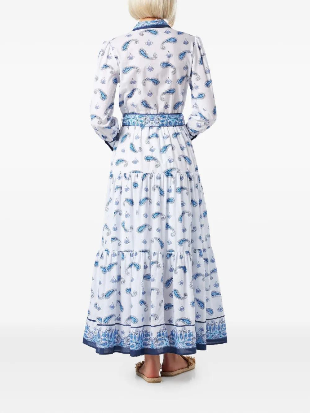 white paisley print tiered skirt button fastening belted waist long sleeves classic collar