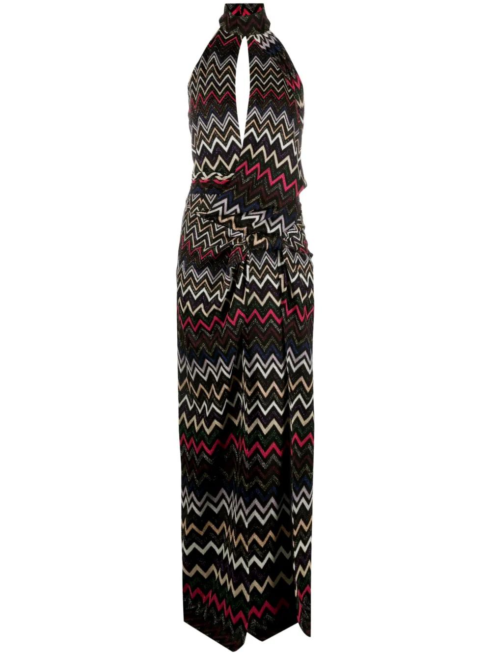 black/multicolour silk blend signature zigzag woven design twist detailing halterneck sleeveless open back maxi The item you receive may differ slightly from the item photographed. This is due to the artisanal nature with which all Missoni products are constructed.