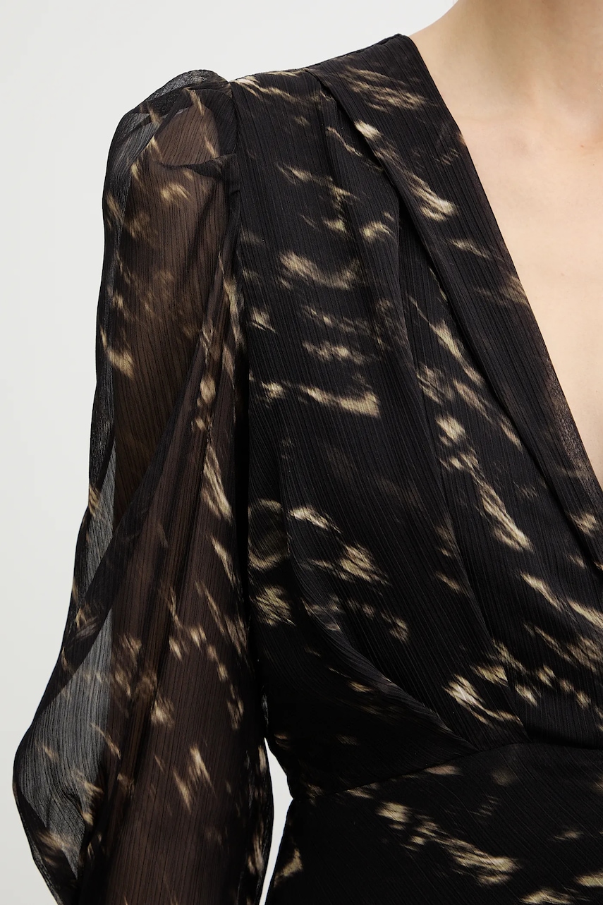 - Prosty, nie blokujący ruchów fason. - Model na podszewce. - Spiczasty, zakładany dekolt. - Z tyłu zapięcie na kryty suwak. - Cienka, nieelastyczna tkanina. - Długość rękawa: 62 cm. - Długość: 130 cm. - Szerokość pod pachami: 44 cm. - Szerokość w talii: 33 cm. - Wymiary podane dla rozmiaru: 36.