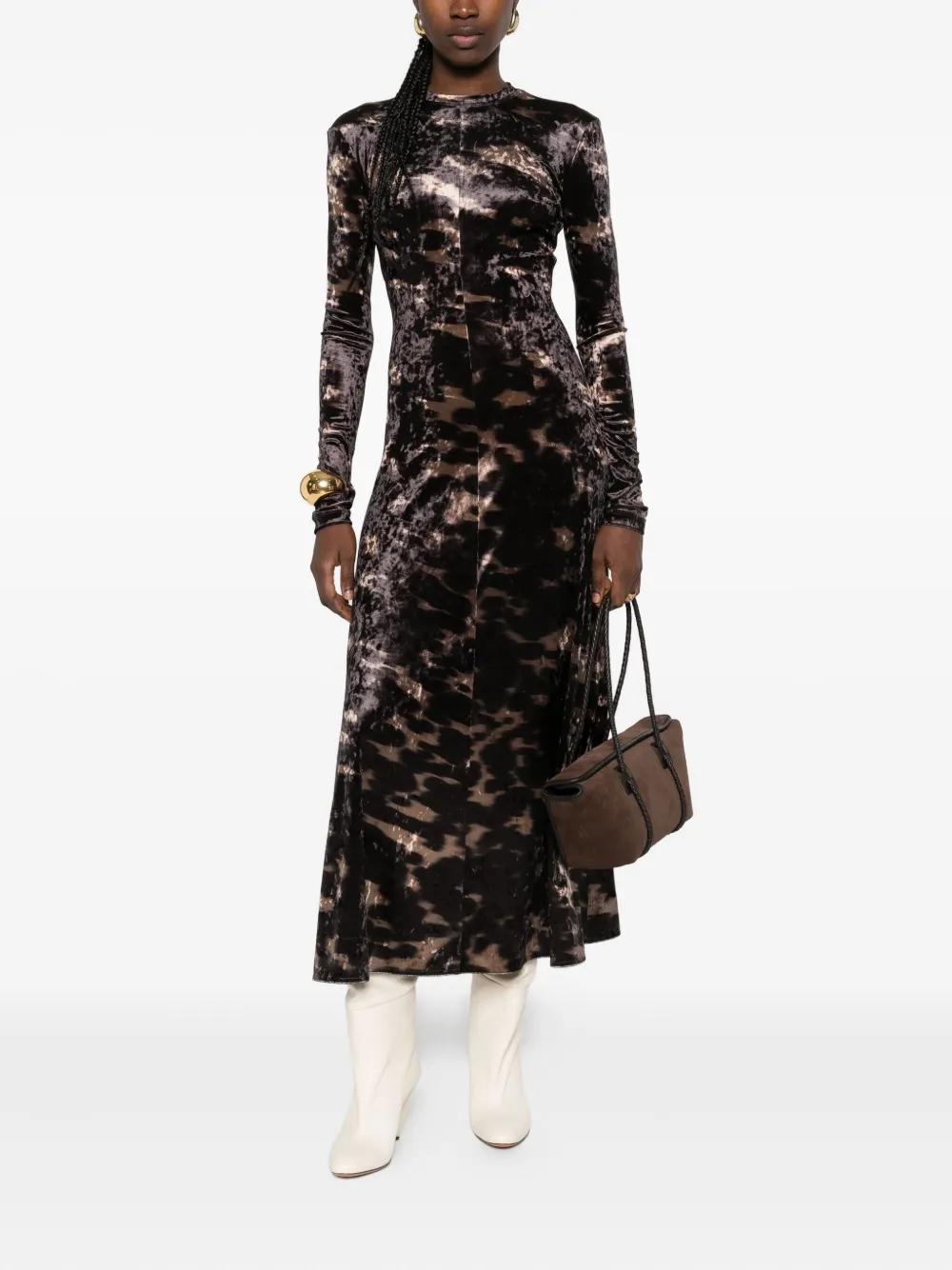 dark-brown black tie-dye pattern long sleeves round neck maxi length