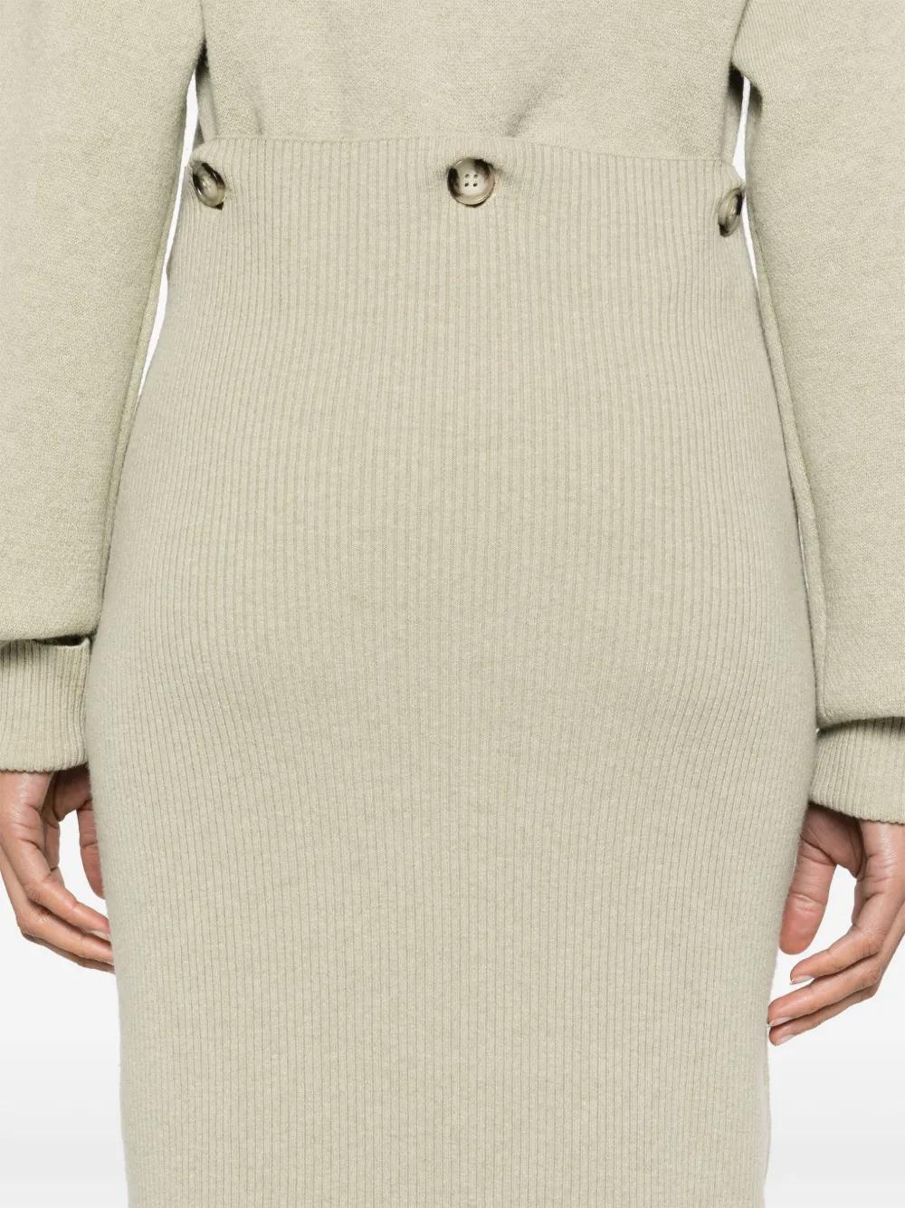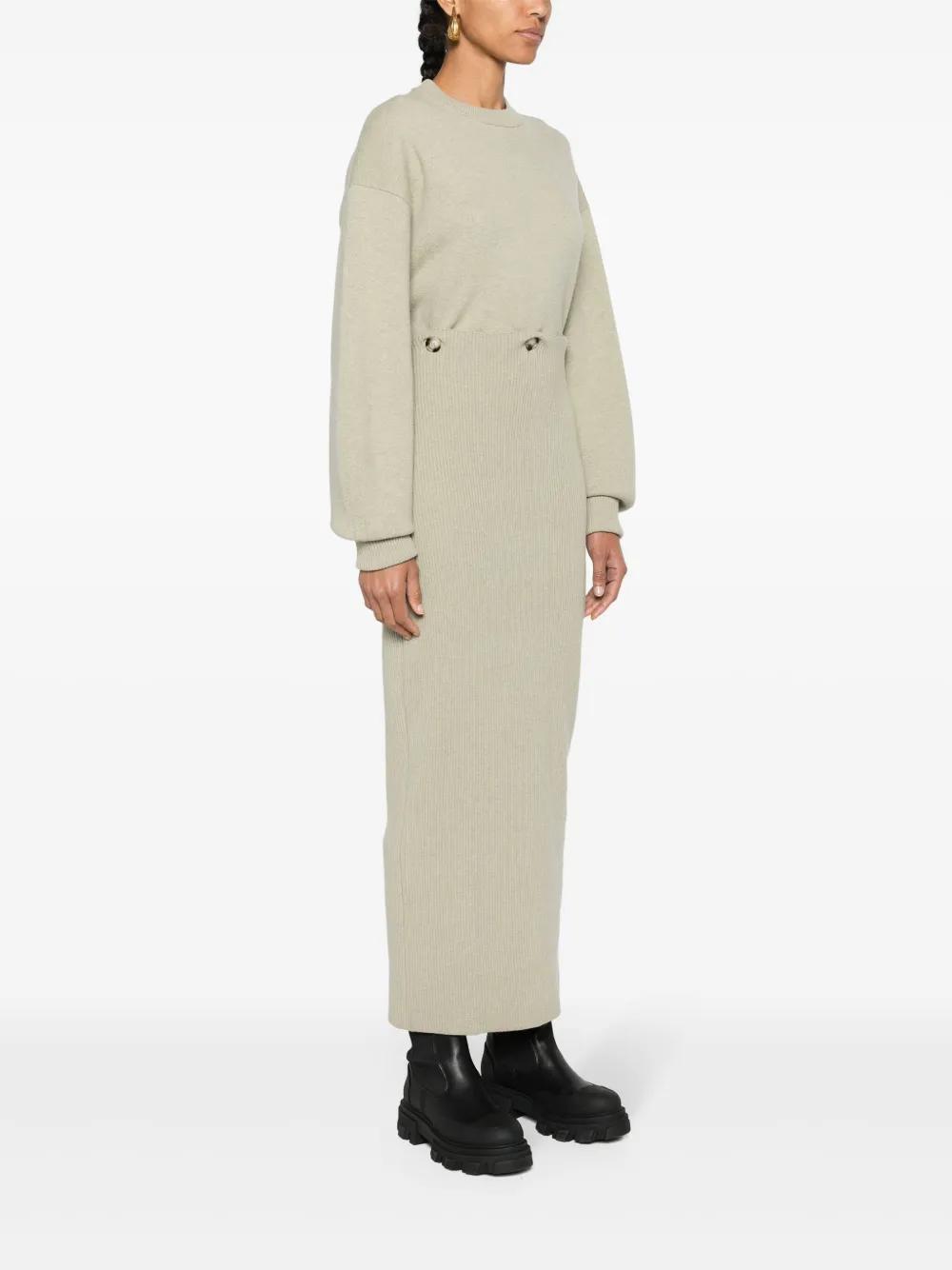 beige merino wool knitted construction crew neck drop shoulder long sleeves with ribbed turn-up cuffs modular button-fastening waist pencil silhouette straight hem mid-length