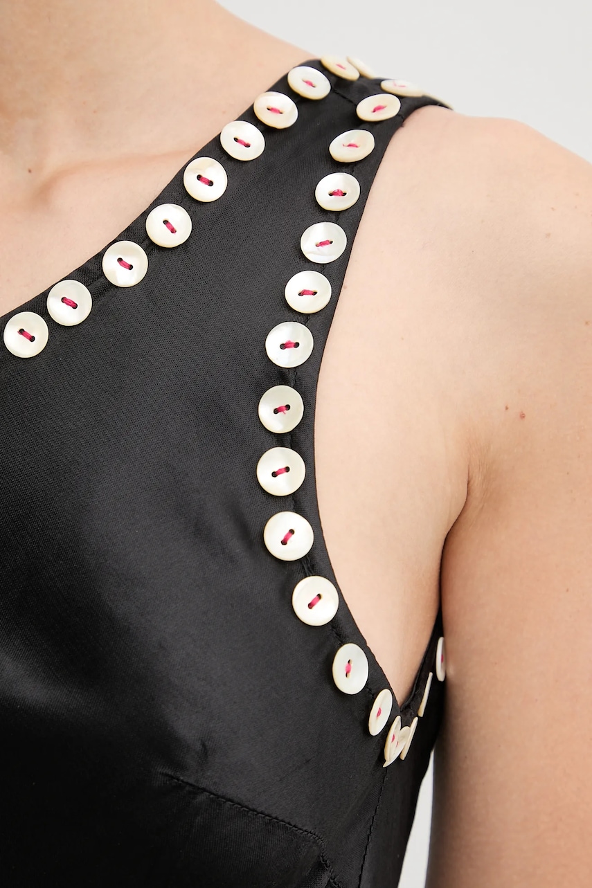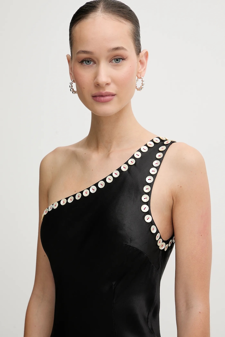 - Prosty fason. - Model na jedno ramię. - Asymetryczny dekolt. - Długość sukienki: 156 cm. - Szerokość pod pachami: 41 cm. - Wymiary podane dla rozmiaru: S.