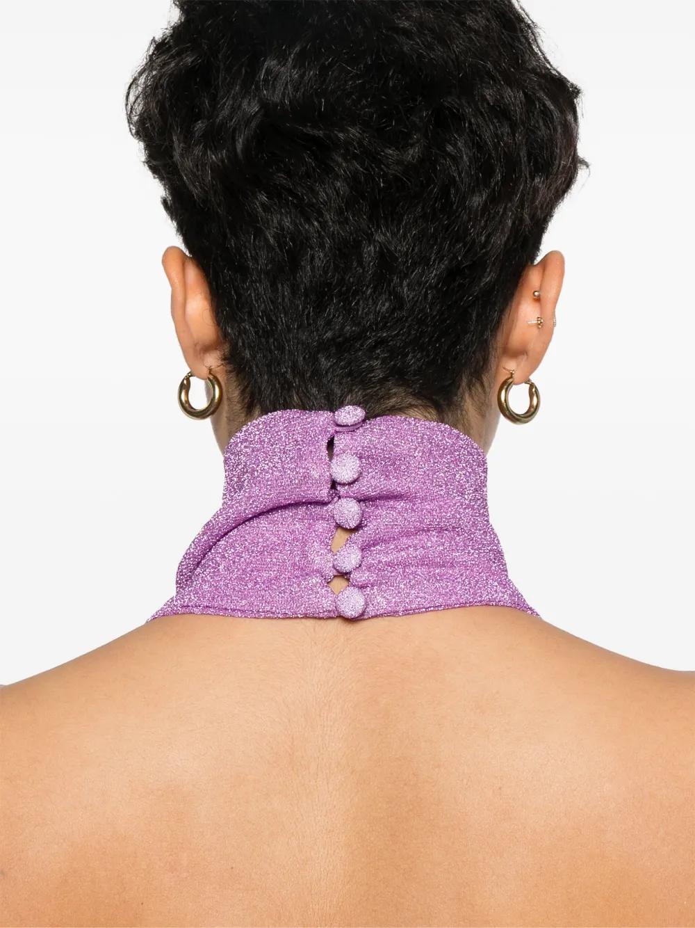 amethyst purple lurex design semi-sheer construction A-line rolled halterneck sleeveless low back side thigh-high slit straight hem long length unlined rear button fastening