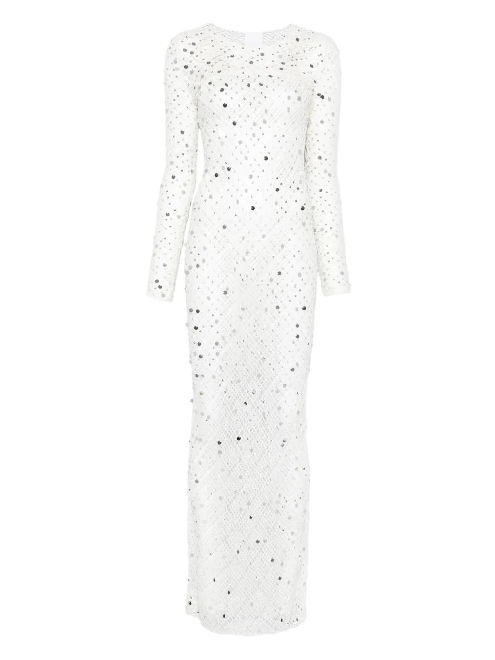 beige sequin embellishment long sleeves maxi length semi sheer construction round neck close-fitting