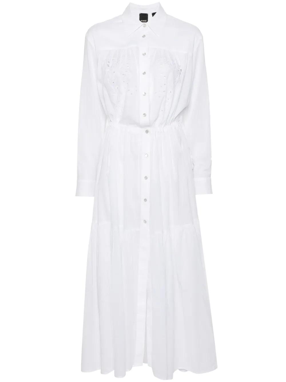 white cotton poplin texture broderie-anglaise detailing gathered detailing panelled design pleat detailing classic collar long sleeves with press-stud fastening cuffs drawstring fastening waist front press-stud fastening long length flared hem unlined