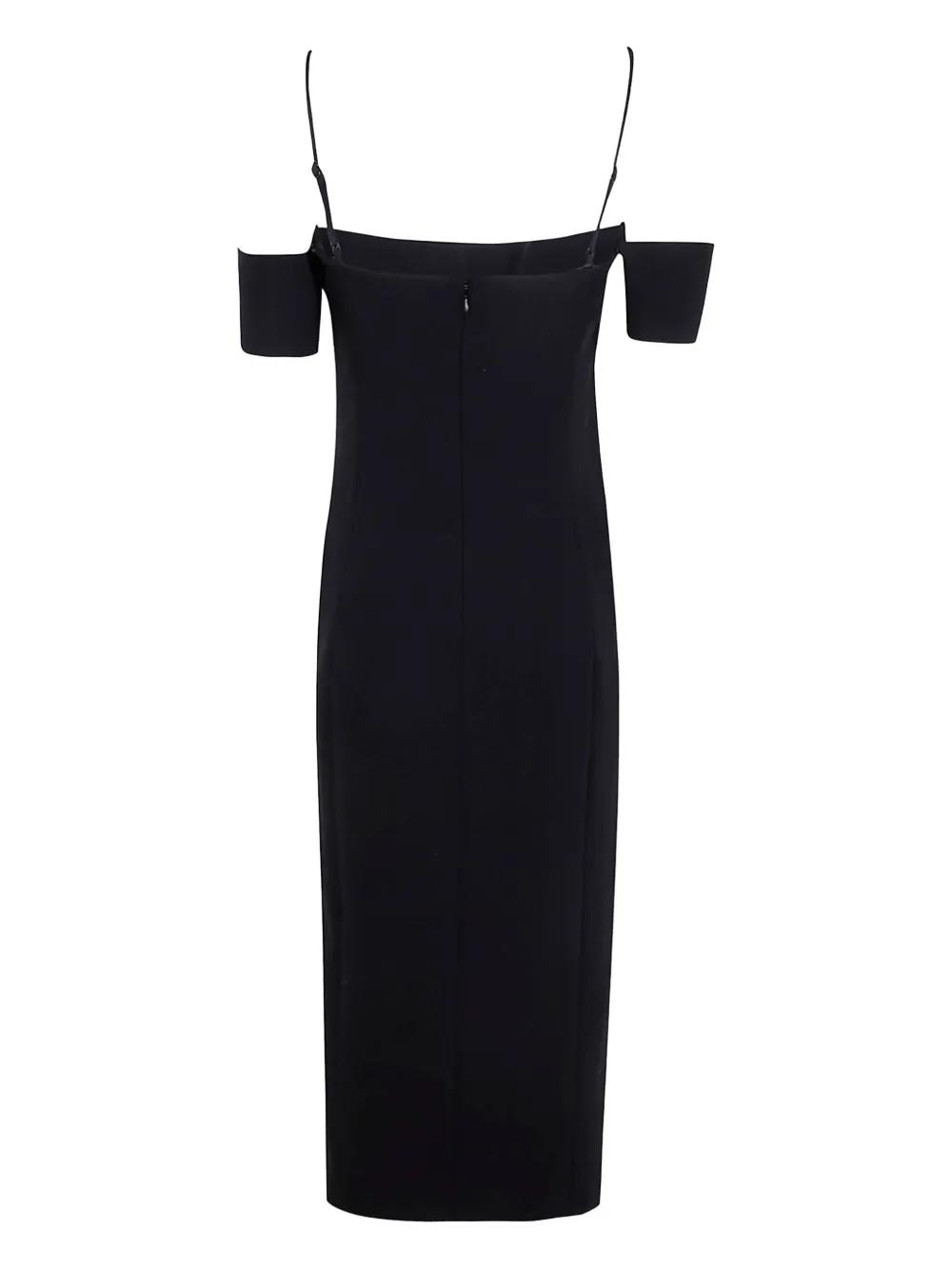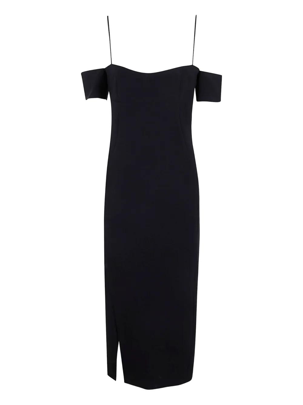 black off-shoulder neckline adjustable spaghetti straps short sleeves concealed rear zip fastening side slit straight hem