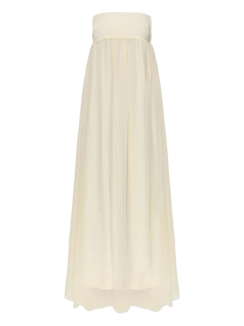 beige bow detail sleeveless draped detailing asymmetric design floor-length