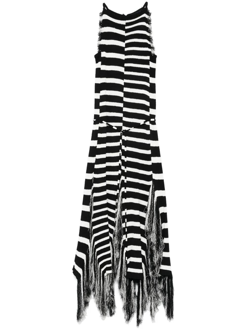 black single rear button fastening detachable belt fringe detailing horizontal stripe pattern