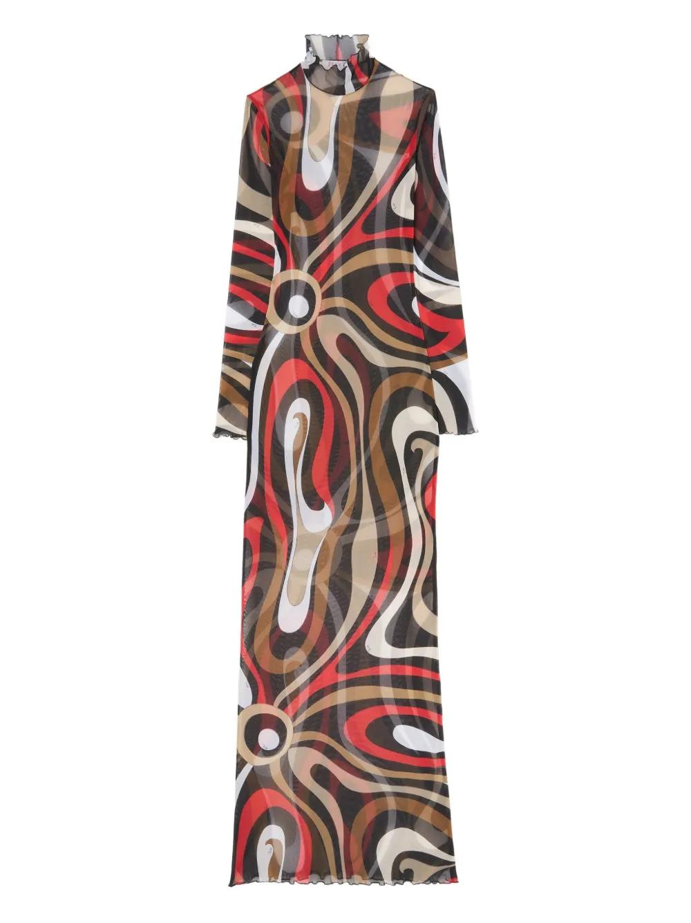 red/multicolour mesh design high neck long sleeves all-over Marmo print lettuce hem