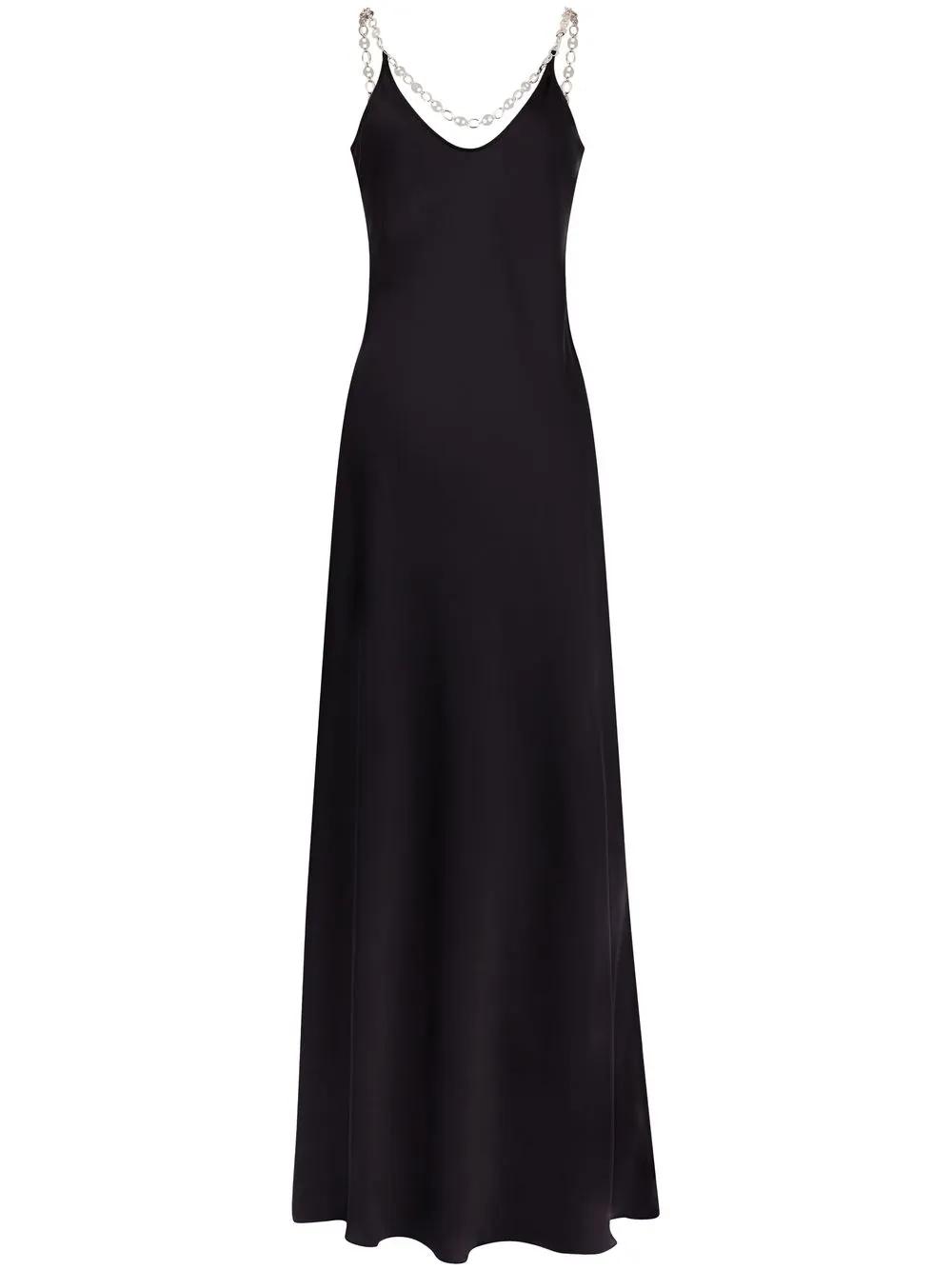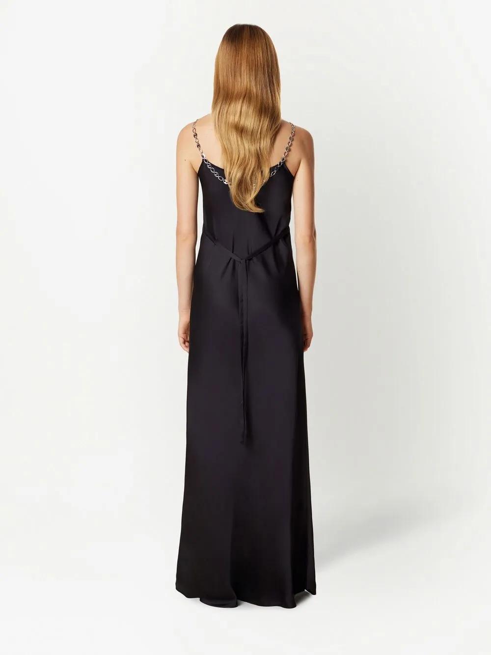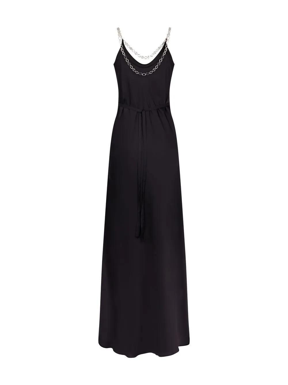 black scoop neck chain-link shoulder strap belted waist floor-length