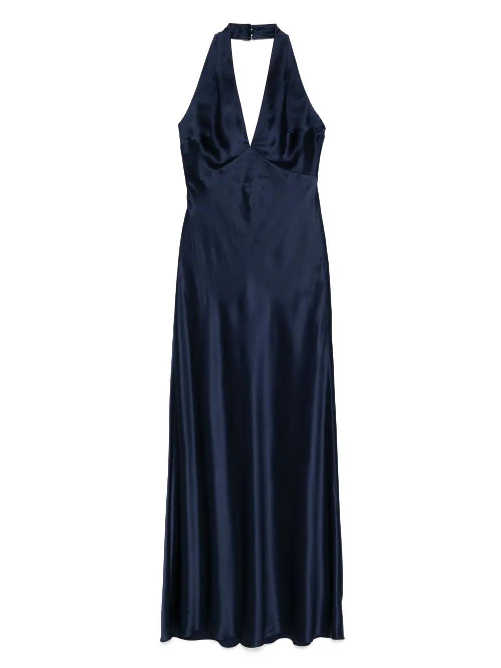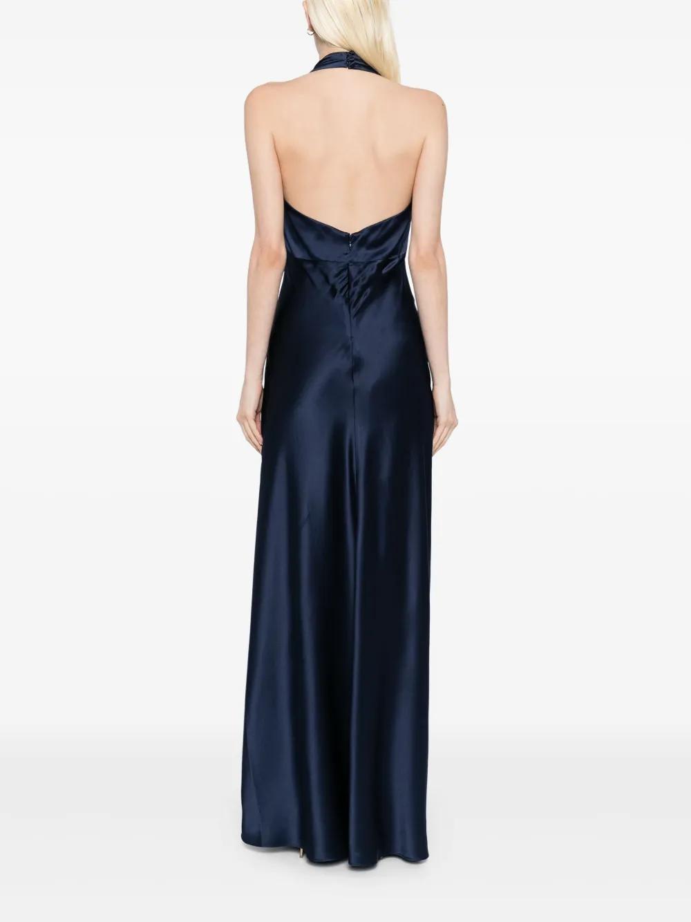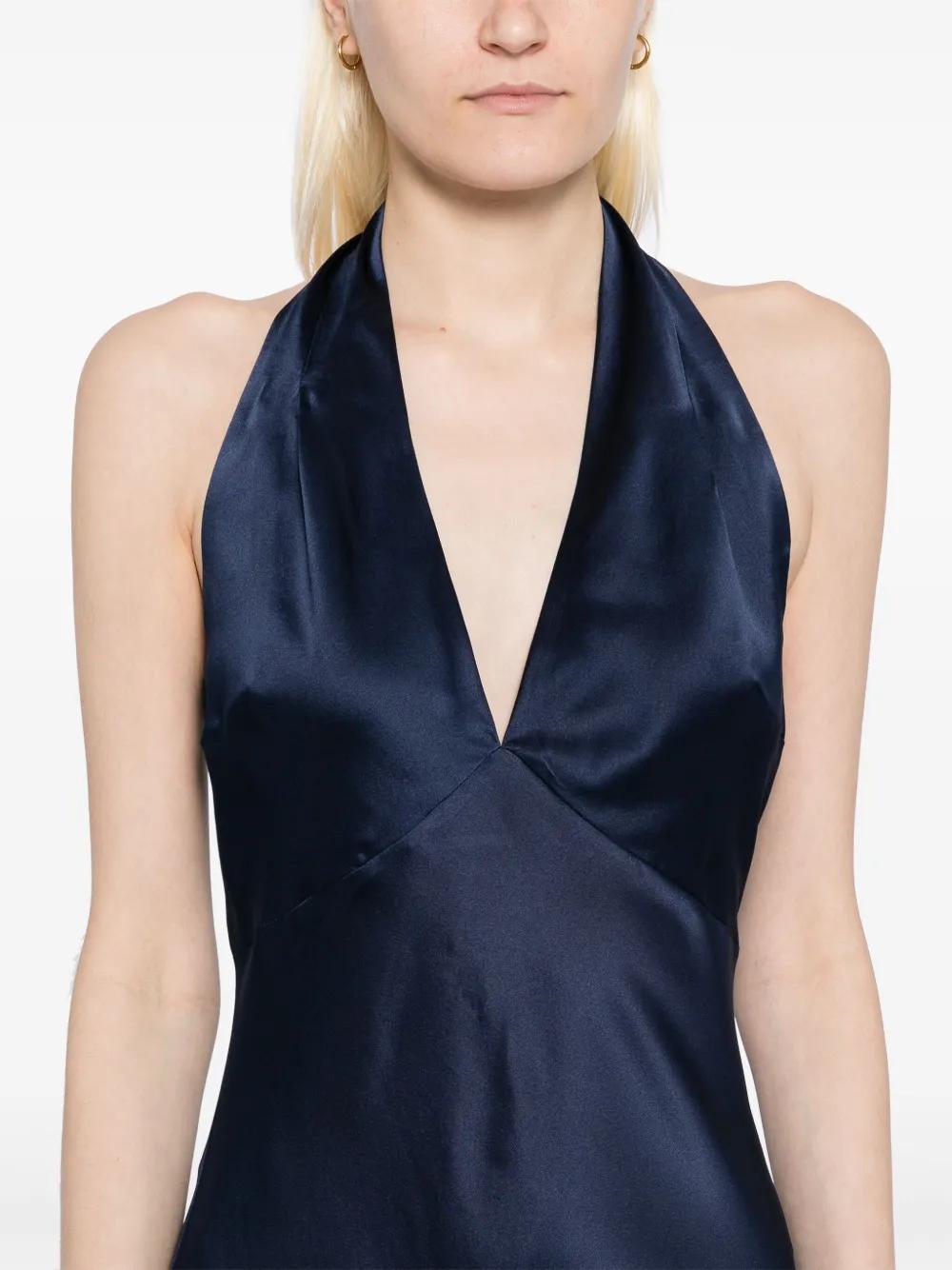 navy blue rear button fastening concealed rear hook and zip fastening plunging V-neck