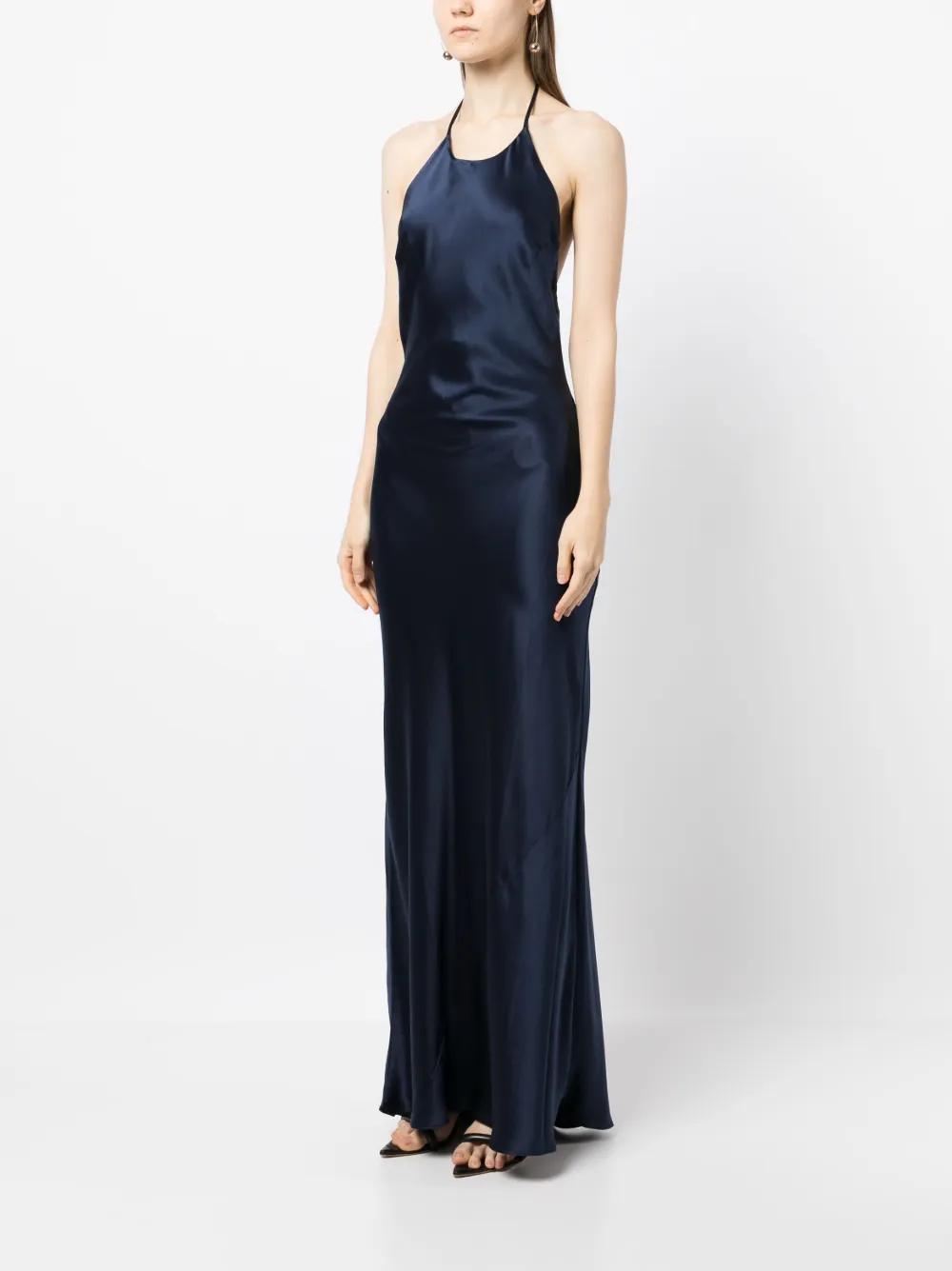 navy blue silk satin finish halterneck tie fastening rear tie fastening sleeveless spaghetti straps straight hem