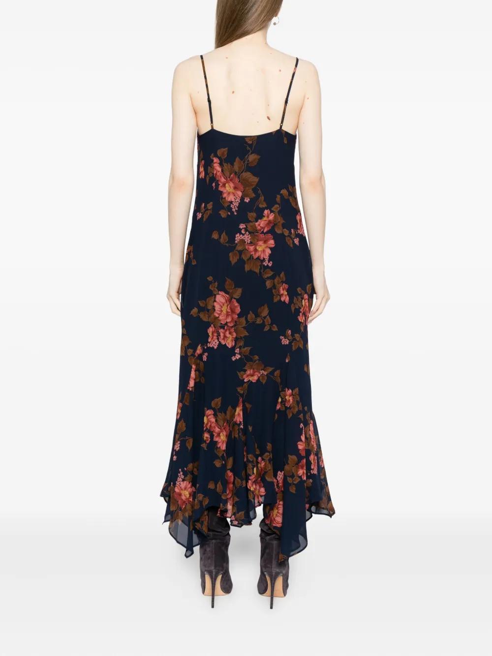 navy blue concealed side hook and zip fastening adjustable shoulder straps all-over floral print asymmetric hem