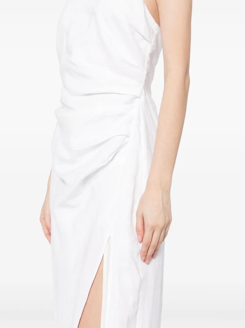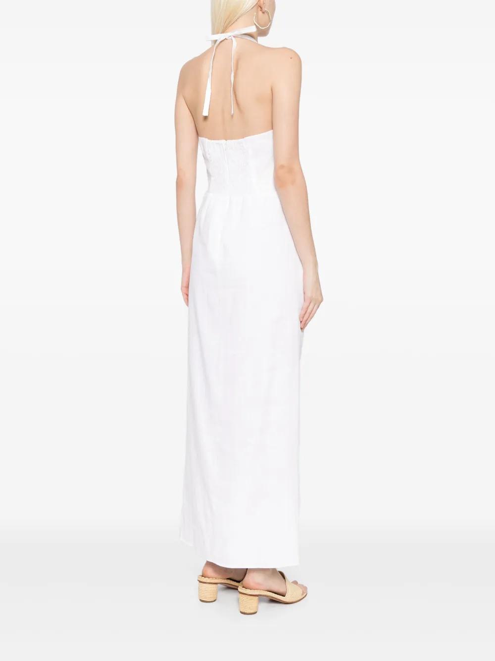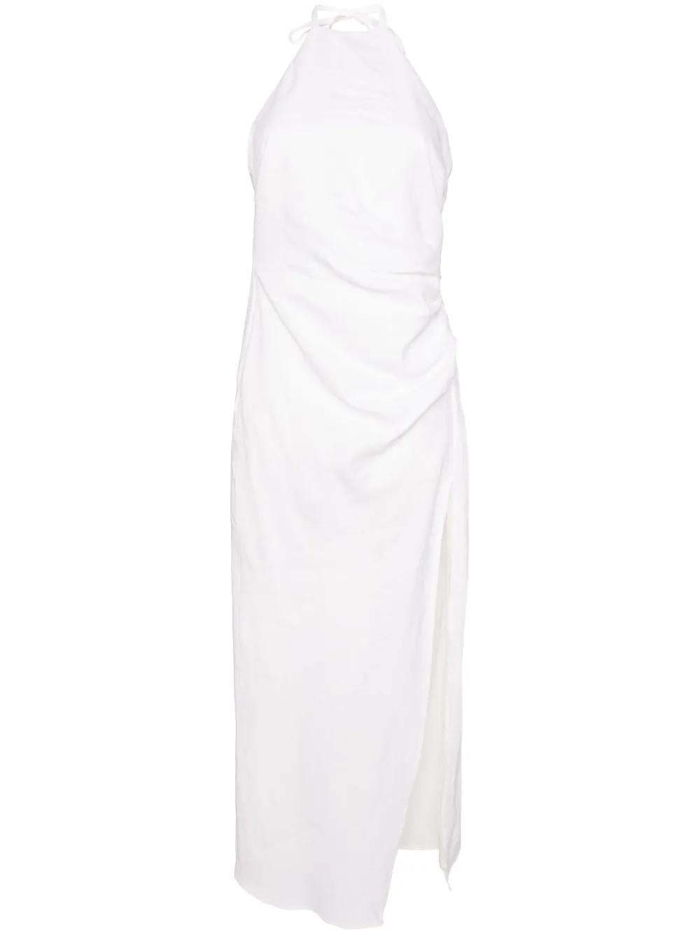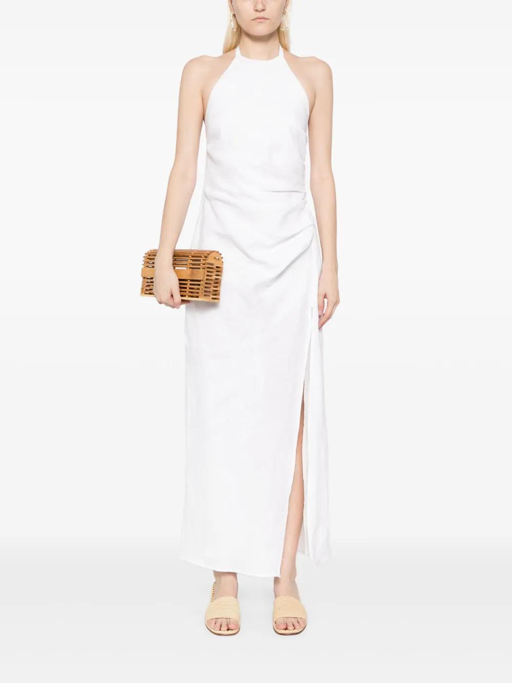 white linen/flax draped detailing smocking details halterneck tie fastening rear zip fastening side slit full lining
