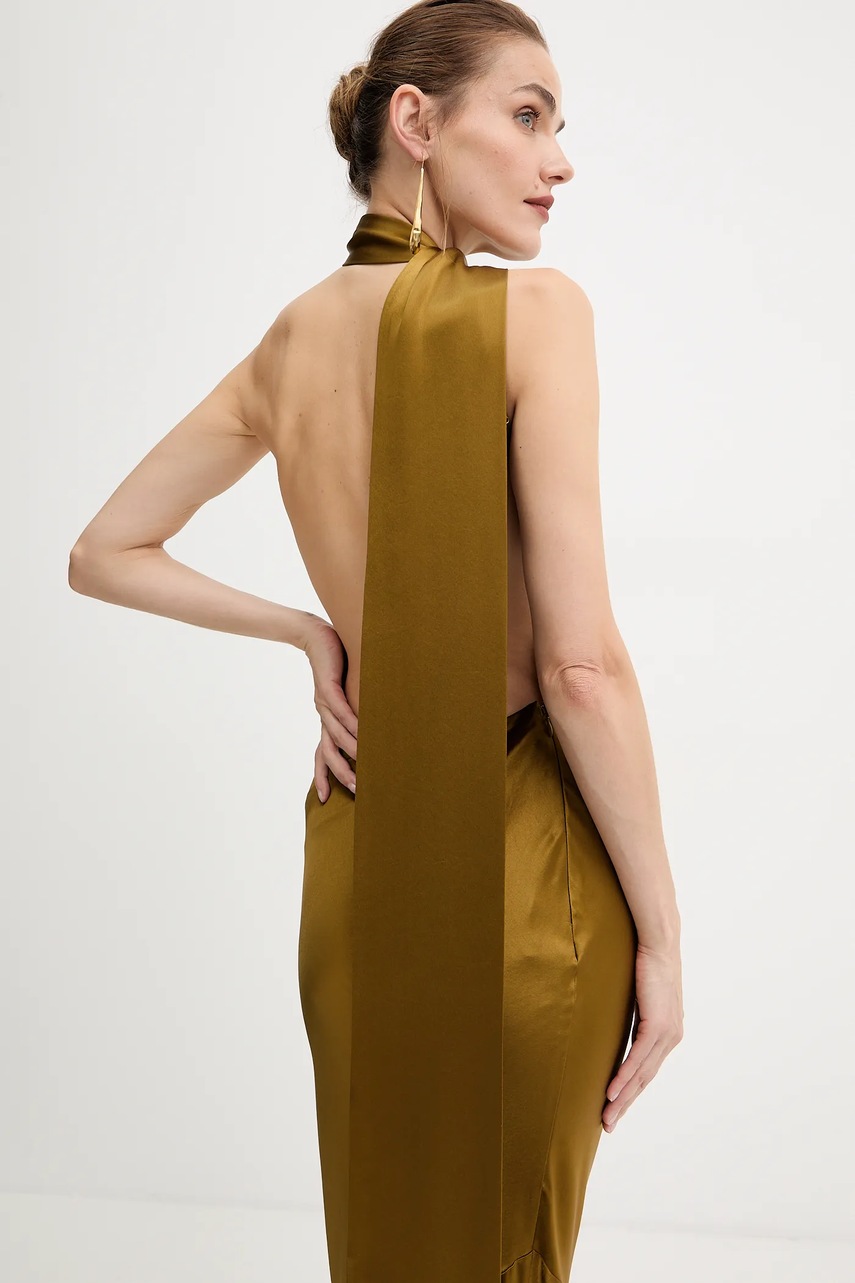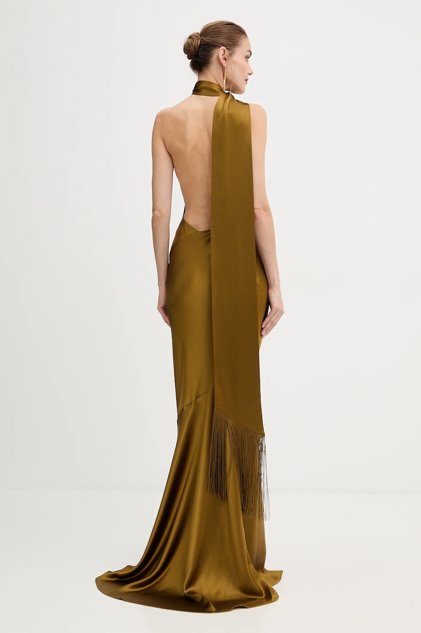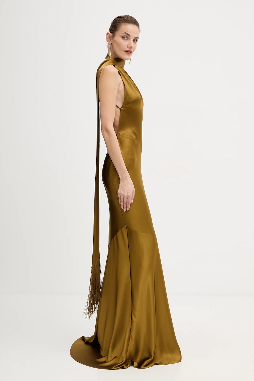 - Dopasowany, podkreślający sylwetkę fason. - Model na jedno ramię. - Model wykonany z materiału o satynowym splocie. - Boczne zapięcie na kryty suwak. - Cienka, nieelastyczna tkanina. - Długość: 163 cm. - Szerokość pod pachami: 39 cm. - Szerokość w talii: 32 cm. - Szerokość w biodrach: 53 cm. - Wymiary podane dla rozmiaru: S.