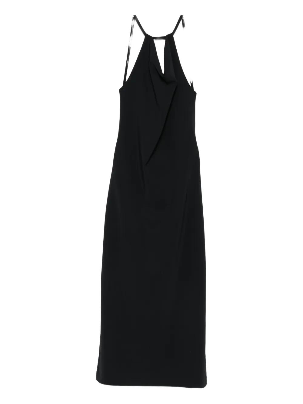 black ribbed knit 3D padded trim crew neck sleeveless brooch detail to the chest rear keeper loop unlined full-length straight hem pull-on style