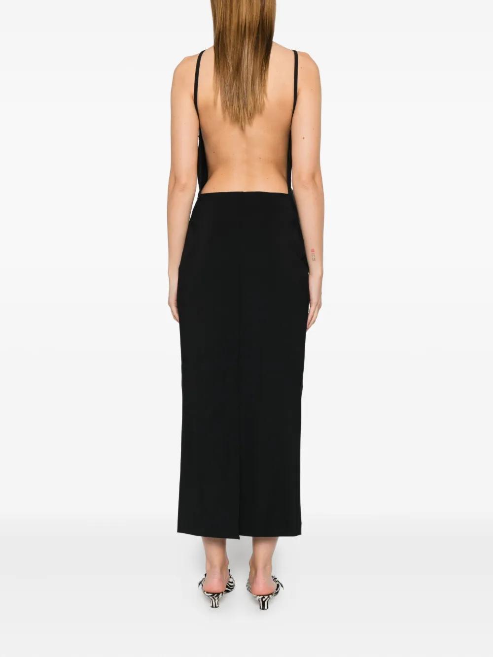 - Dopasowany fason. - Model o długości maxi. - Model z gorsetem. - Z tyłu ozdobne rozcięcie. - Wycięcie na plecach. - Z tyłu kryte zapięcie na suwak. - Gruba, elastyczna tkanina. - Długość: 148 cm. - Szerokość pod pachami: 33 cm. - Wymiary podane dla rozmiaru: 36.