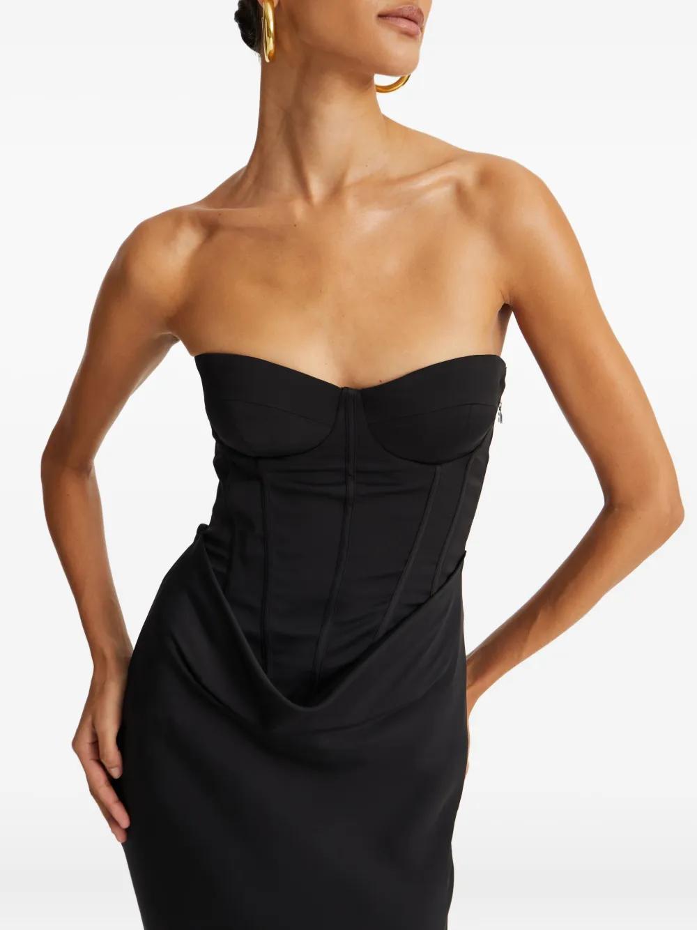 black strapless fitted bodice boning detail draped skirt maxi length