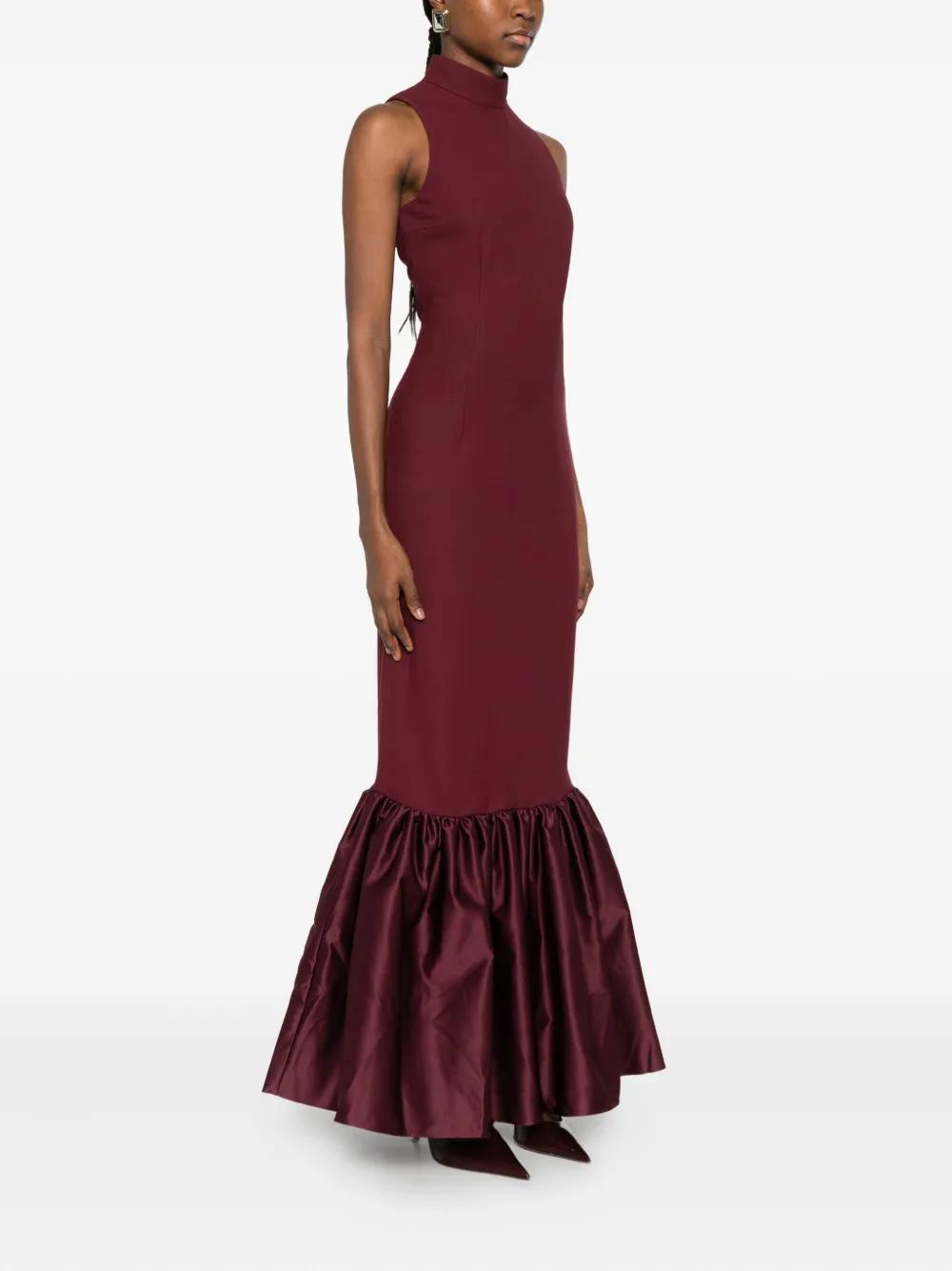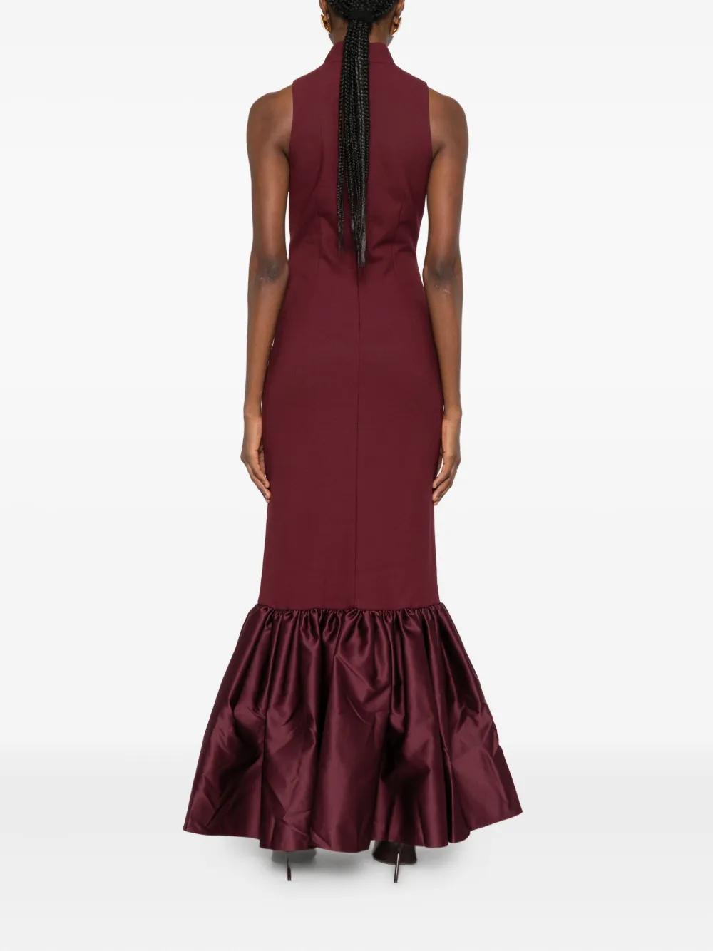 burgundy high neck sleeveless ruffled hem concealed rear zip fastening