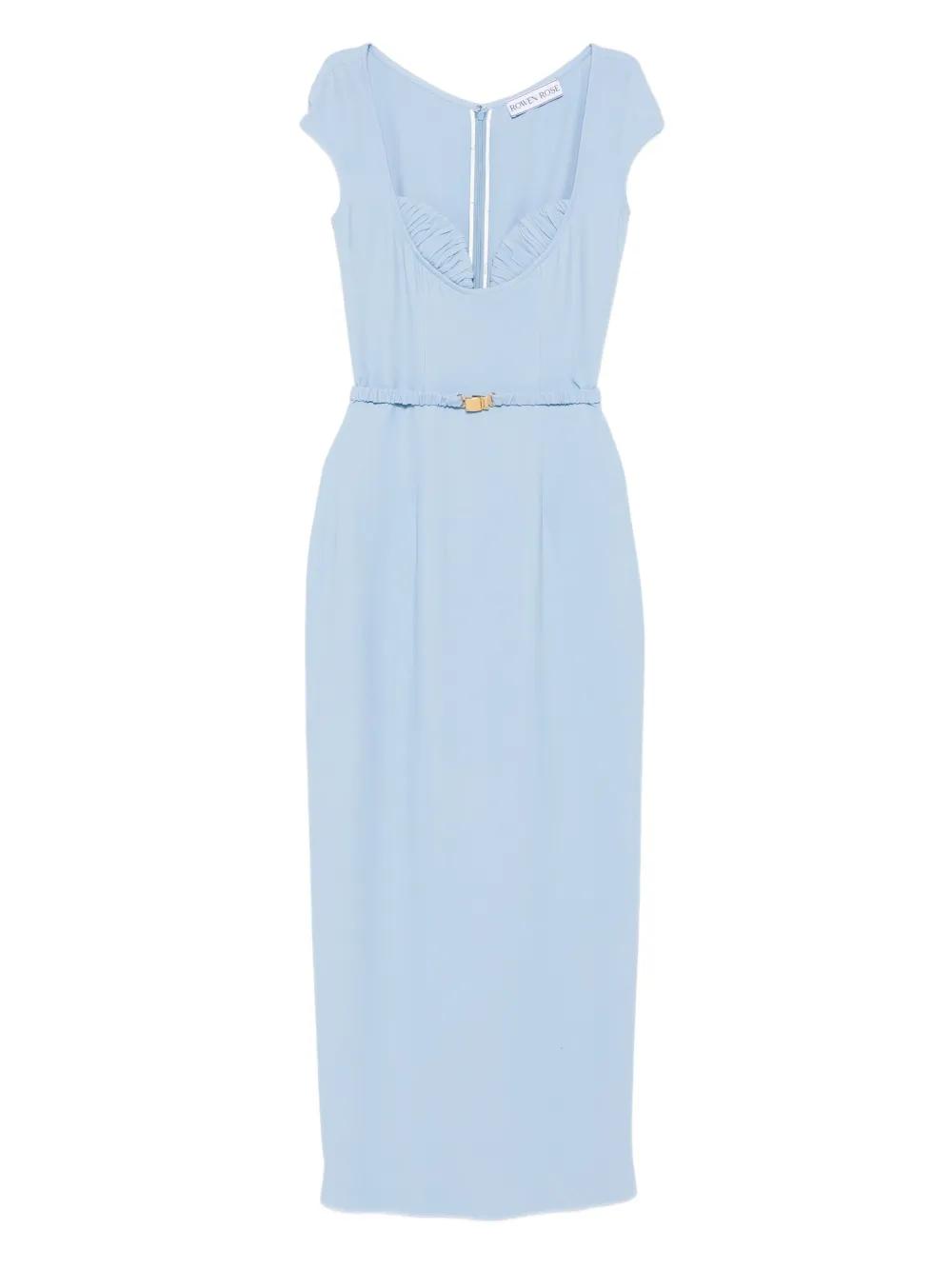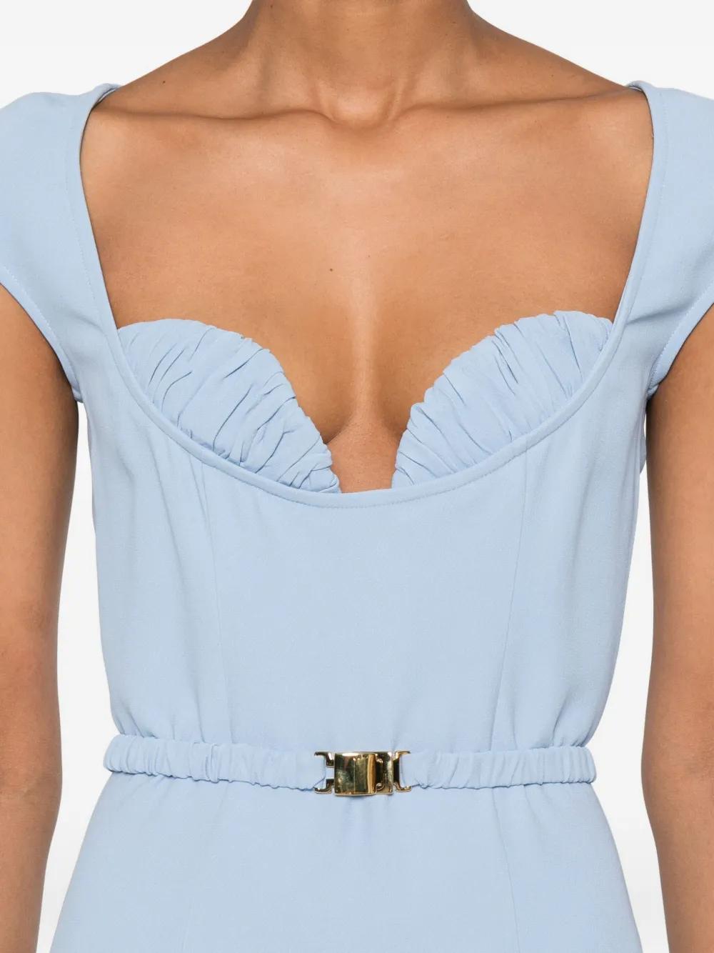 light blue cap sleeves fitted waistline scoop neck belted waist straight skirt