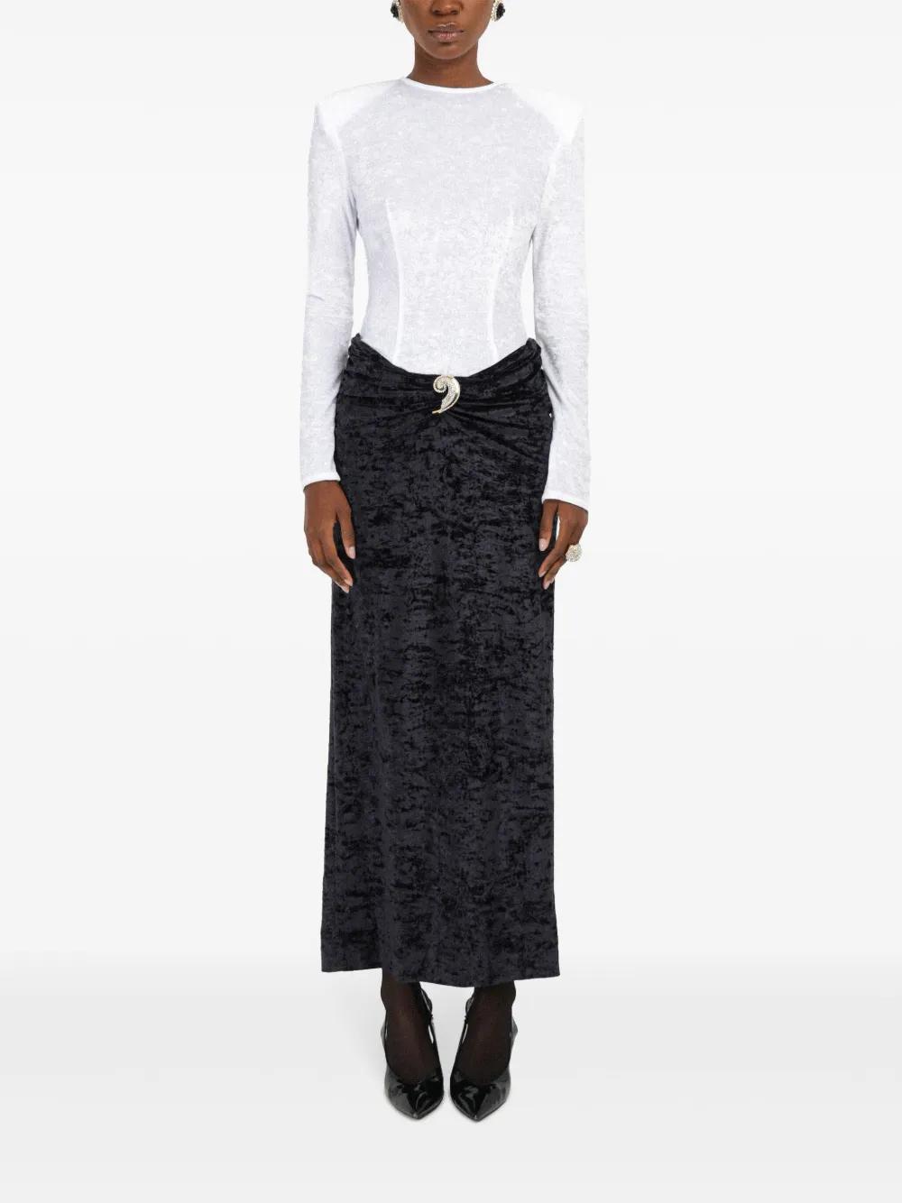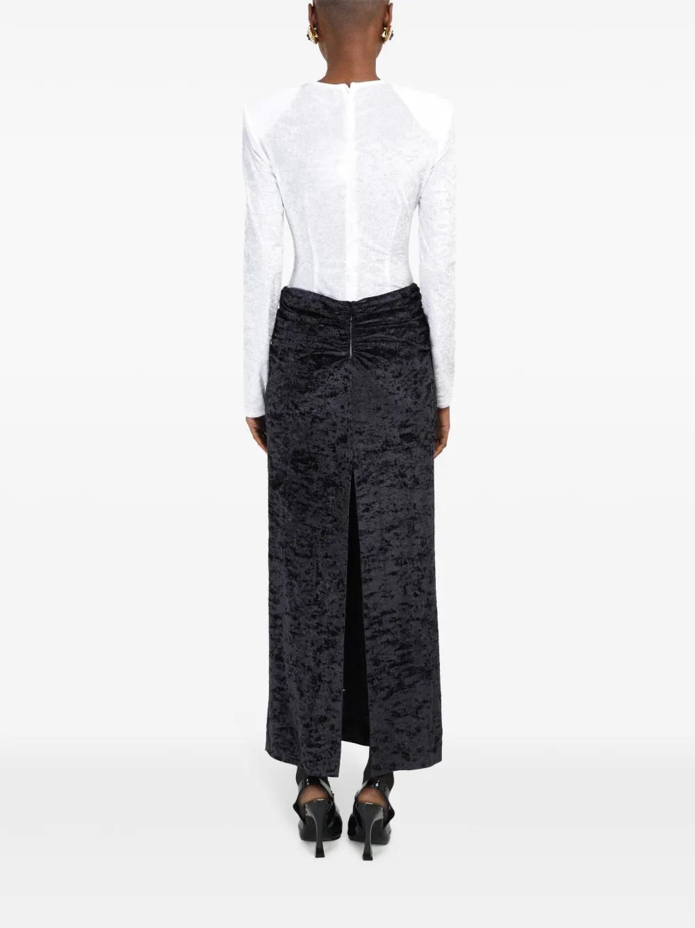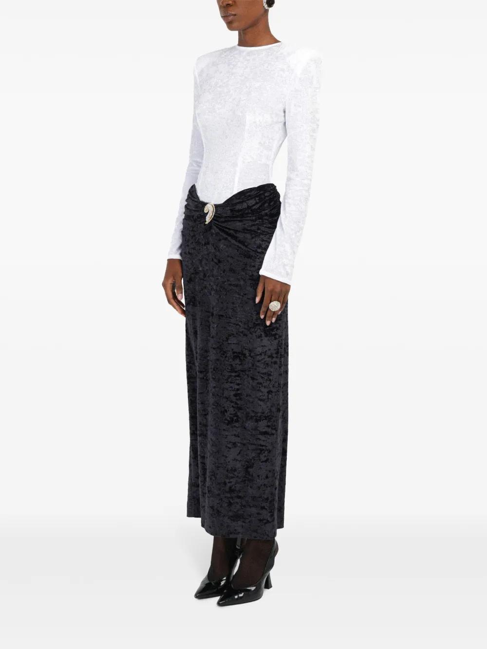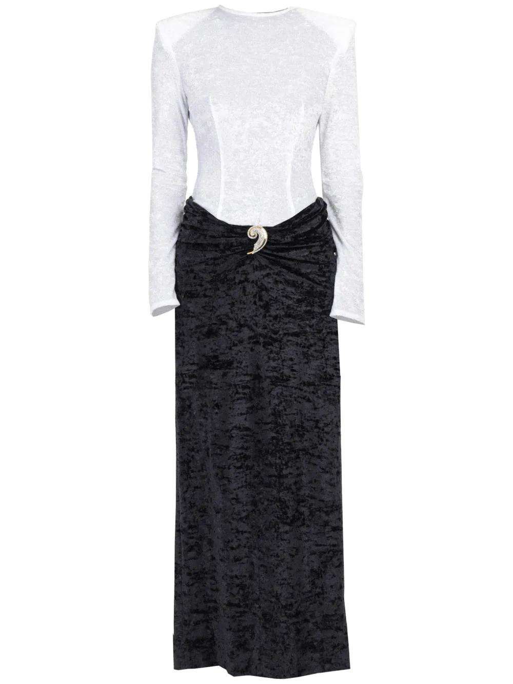 black/white crushed velvet brooch detail concealed rear zip fastening round neck shoulder pads long sleeves ruched detailing rear slit straight hem