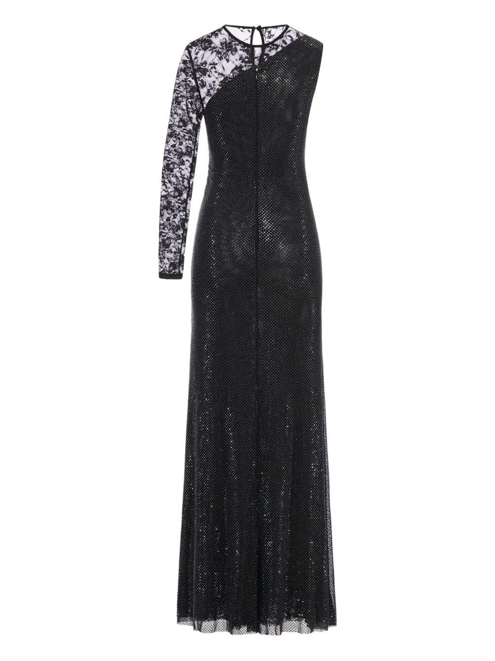 black embellishment detail one-shoulder neckline long sleeve lace panel