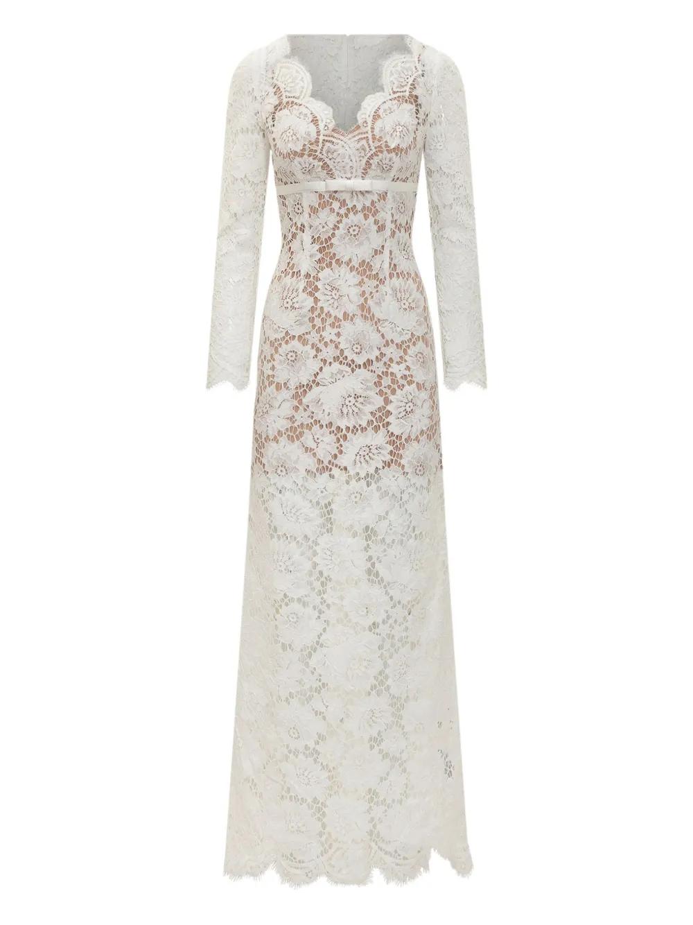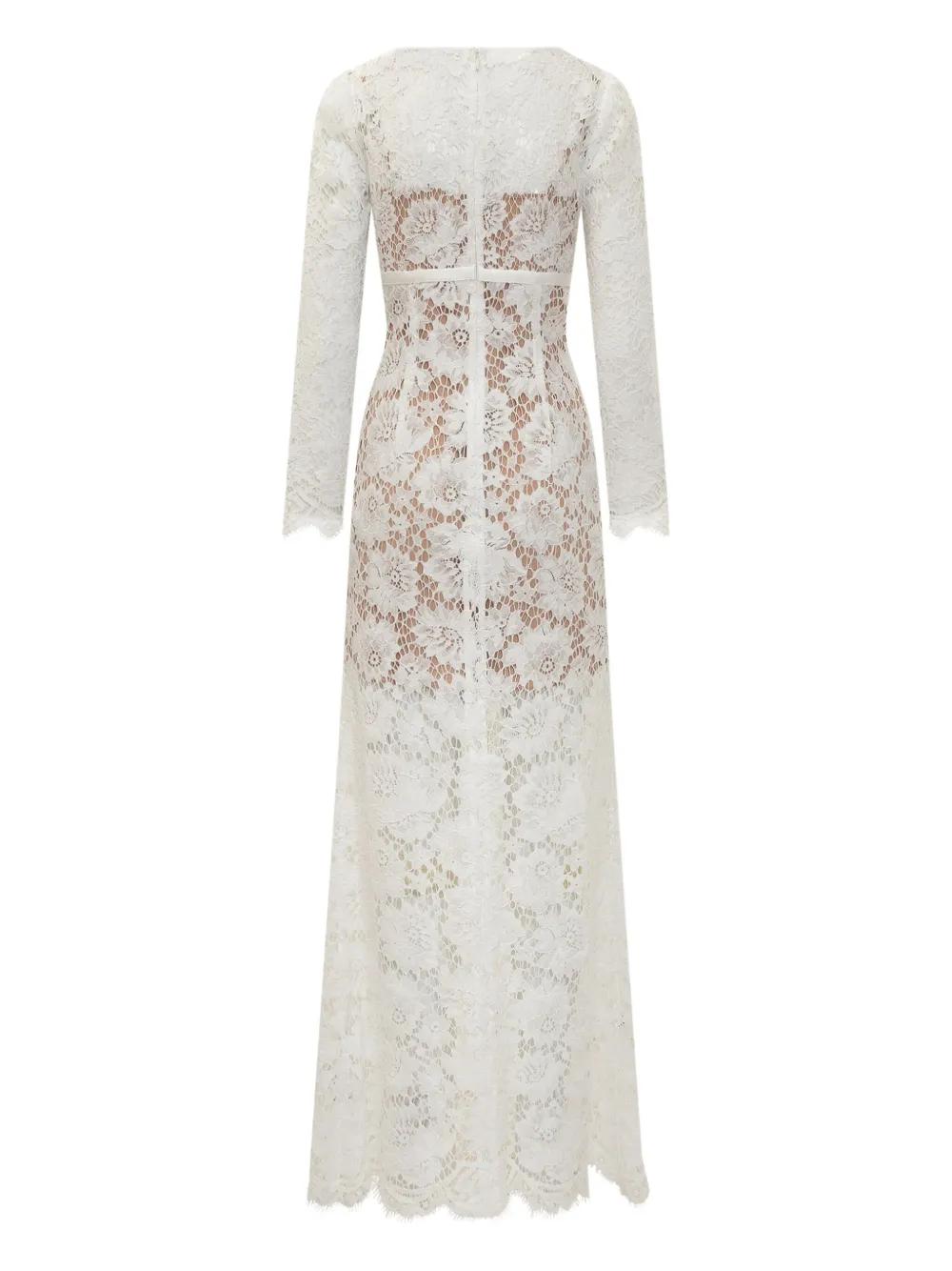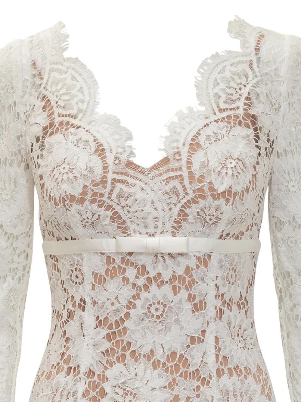 white floral-lace pattern long sleeves V-neck bow detail long length