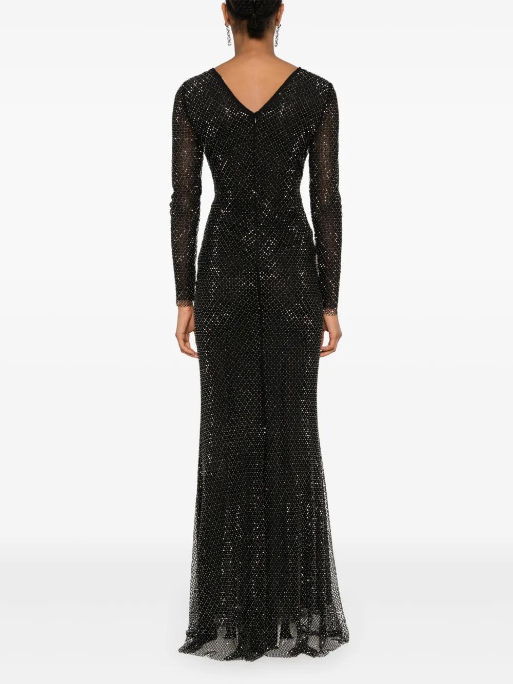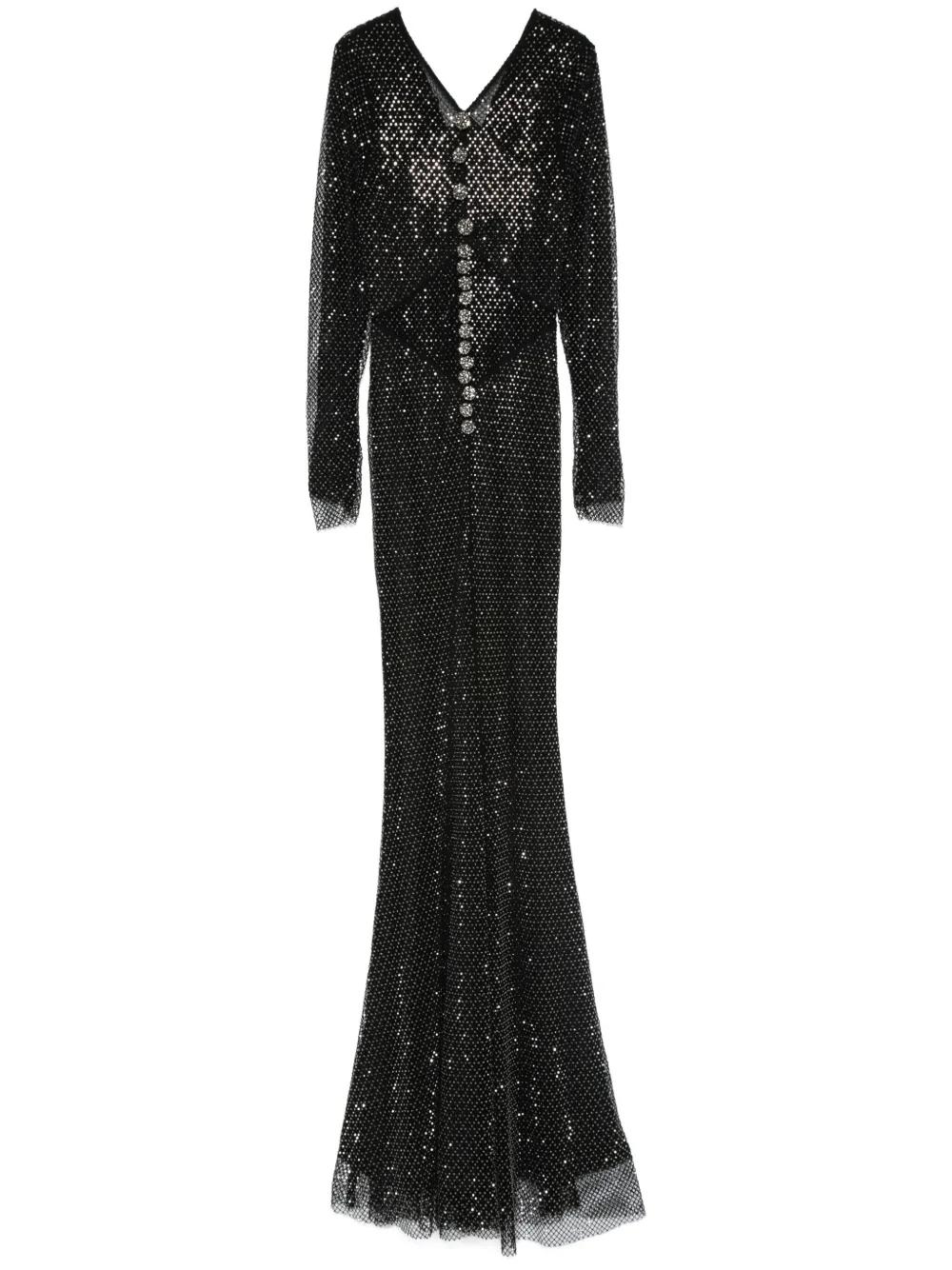 black semi-sheer construction mesh design panelled design rhinestone embellishment concealed rear hook and zip fastening V-neck long sleeves decorative button detailing V-back fitted waistline flared full lining floor-length