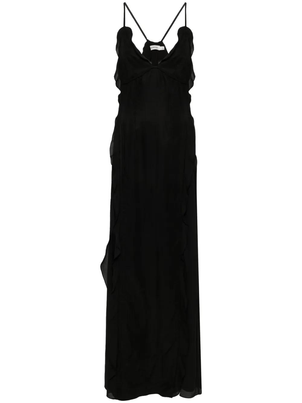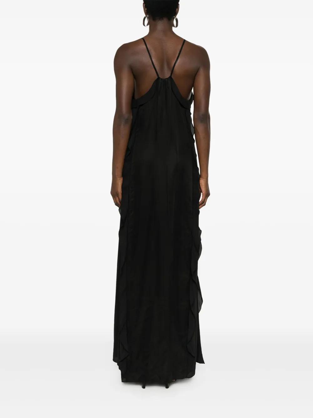 black V-neck spaghetti straps sleeveless ruffled detailing dart detailing front slit floor-length full lining pull-on style