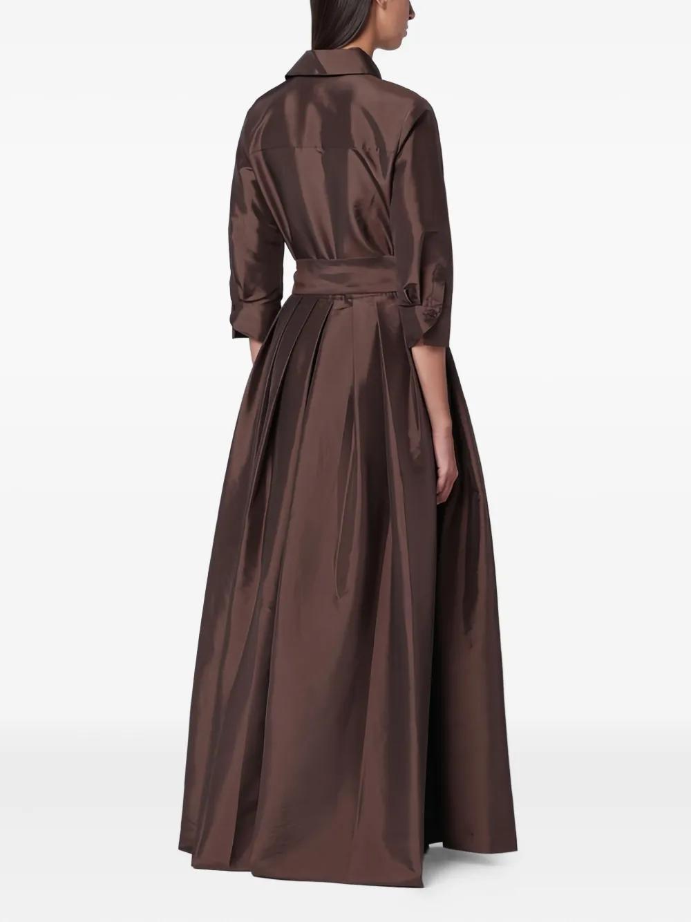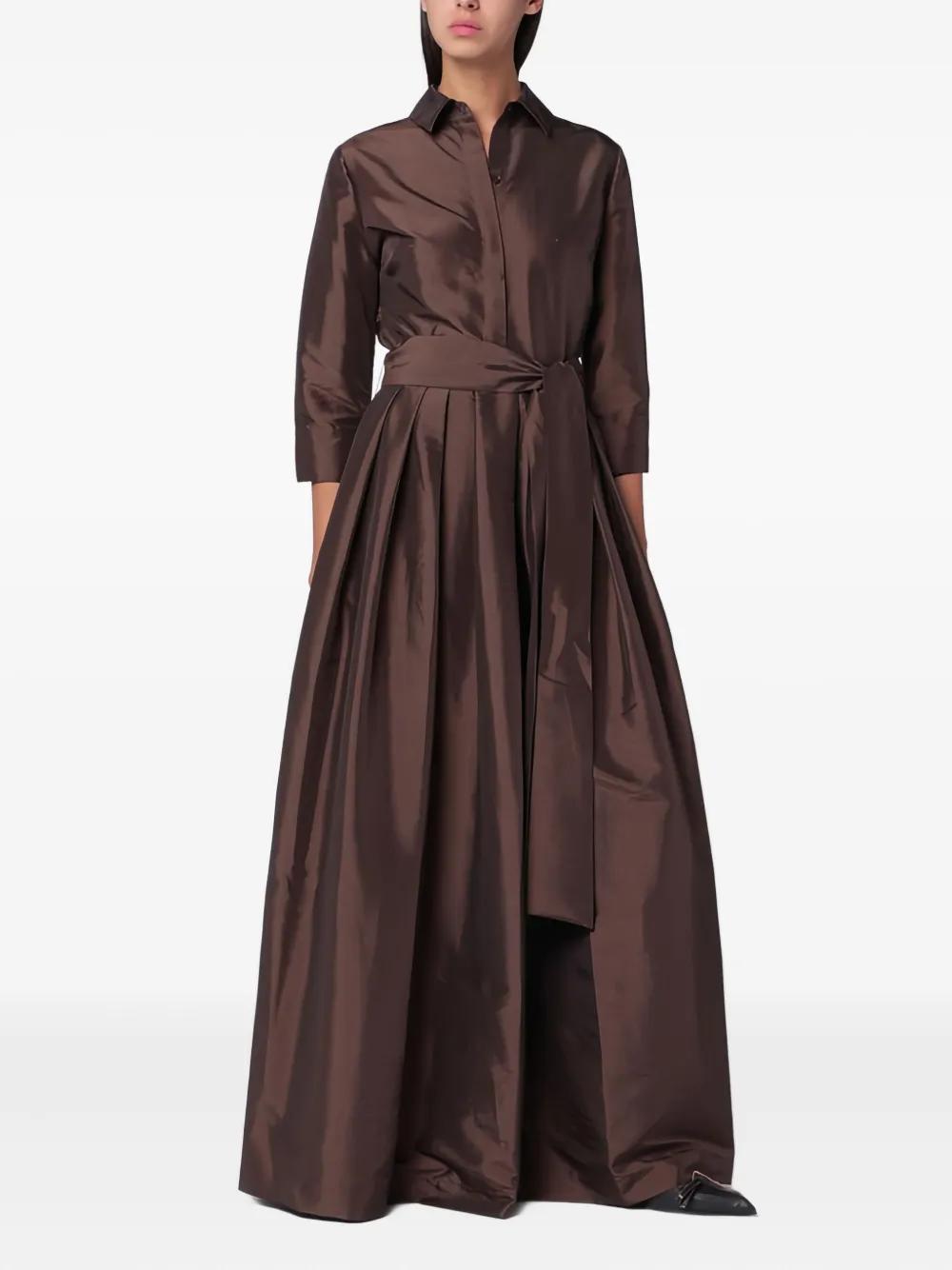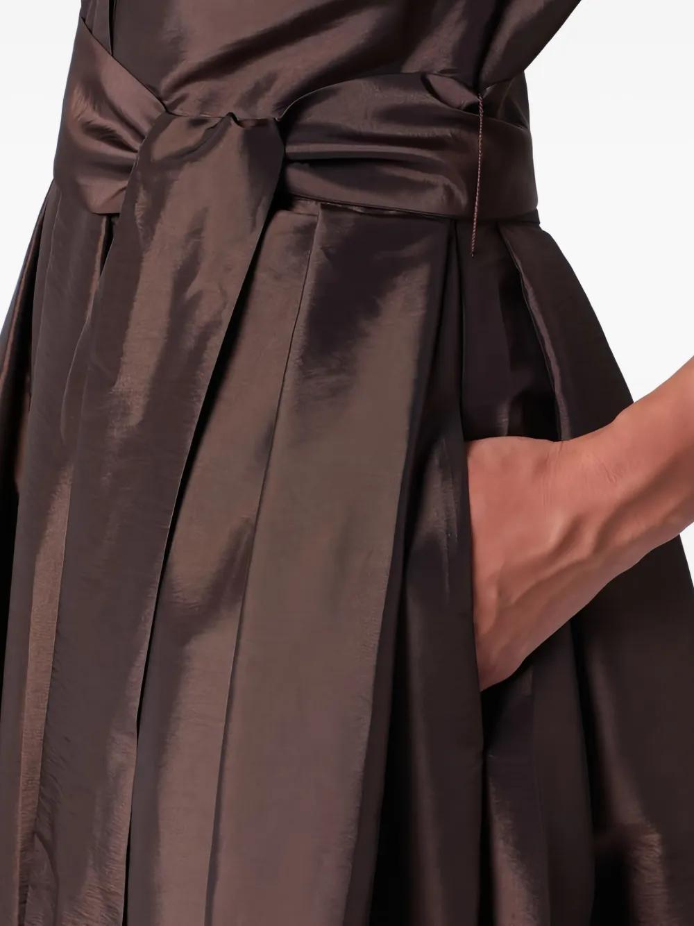 chocolate point collar three-quarter sleeves tie waist side pockets pleated skirt