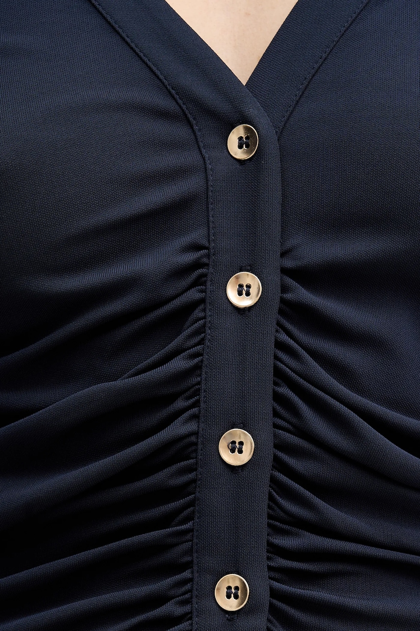 - Dopasowany, podkreślający sylwetkę fason. - Ozdobny, spiczasty dekolt. - Krótkie zapięcie na guziki ułatwia sprawną wentylację oraz swobodne ubieranie i ściąganie. - Model z ozdobnymi marszczeniami. - Model bez podszewki. - Długość rękawa: 66 cm. - Długość: 133 cm. - Szerokość pod pachami: 45 cm. - Szerokość w talii: 33 cm. - Szerokość w biodrach: 40 cm. - Wymiary podane dla rozmiaru: S.