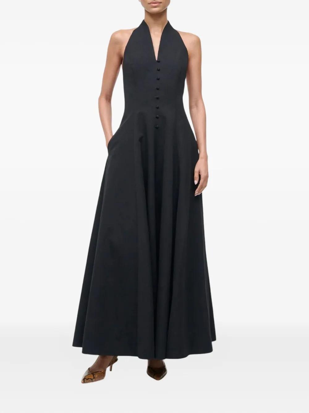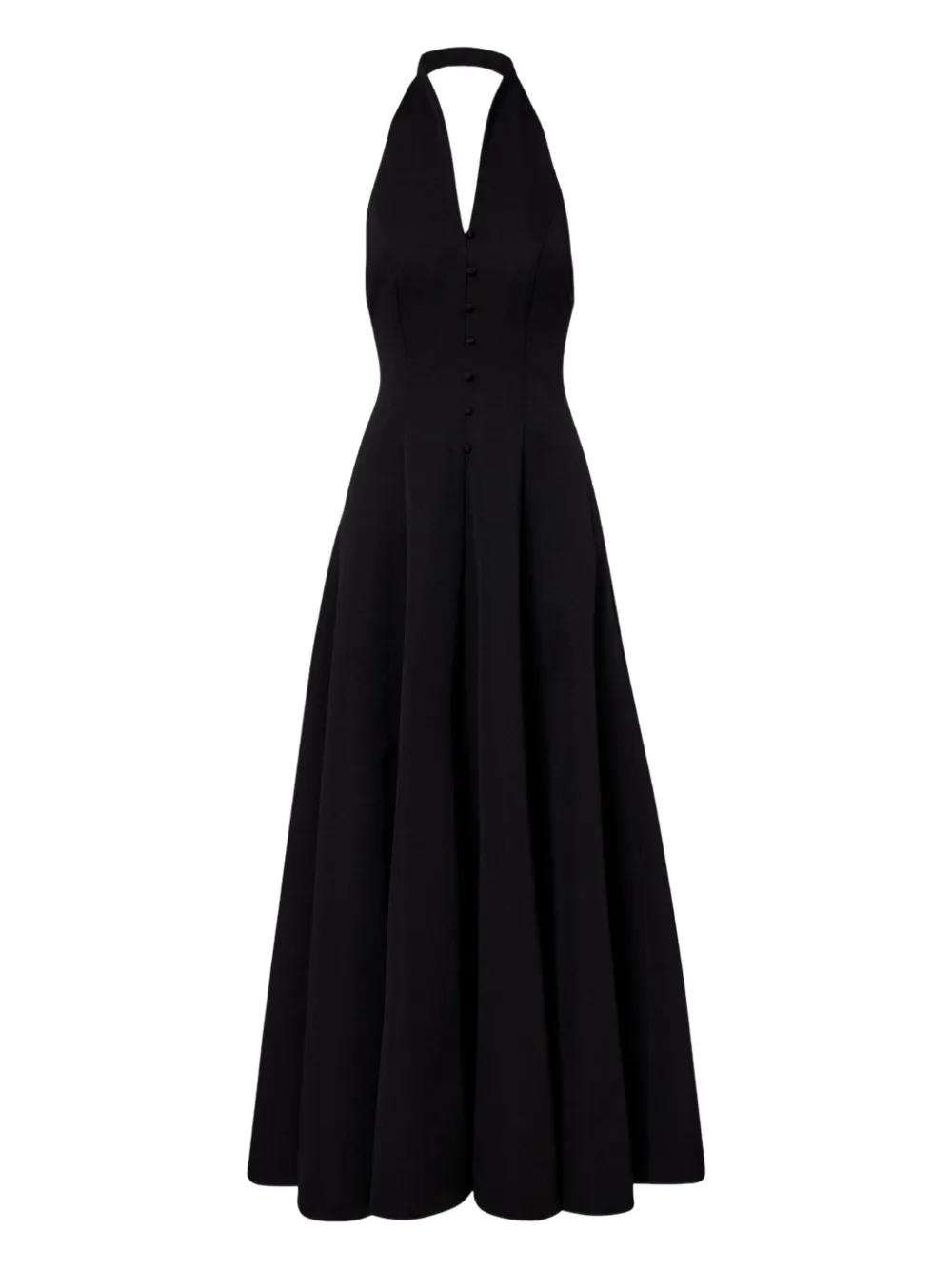 black cap sleeves high collar asymmetric draping deep V-back overlapping panels side slit