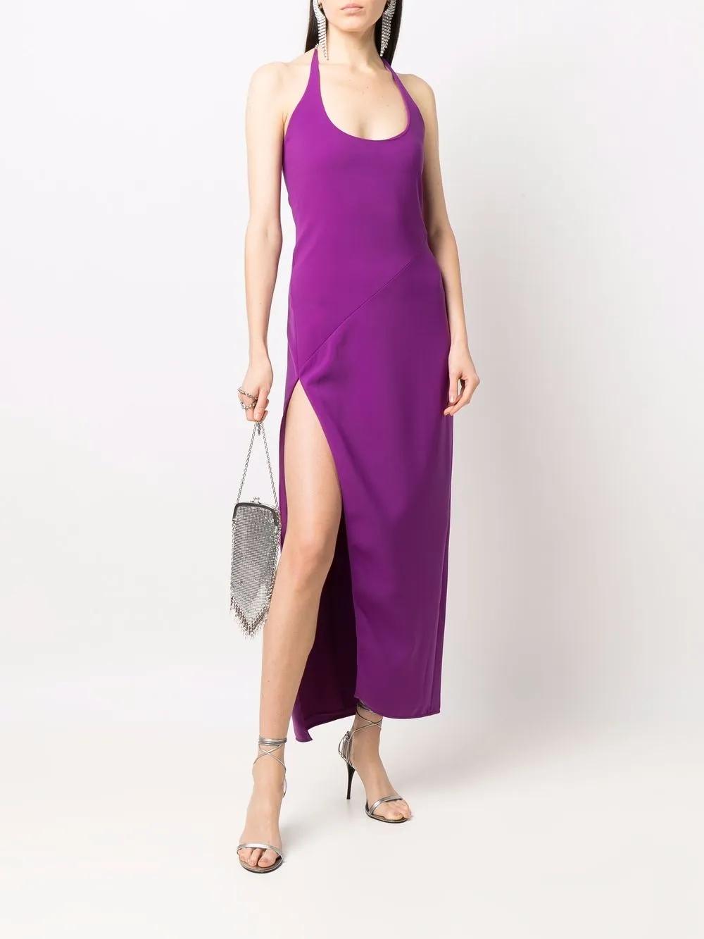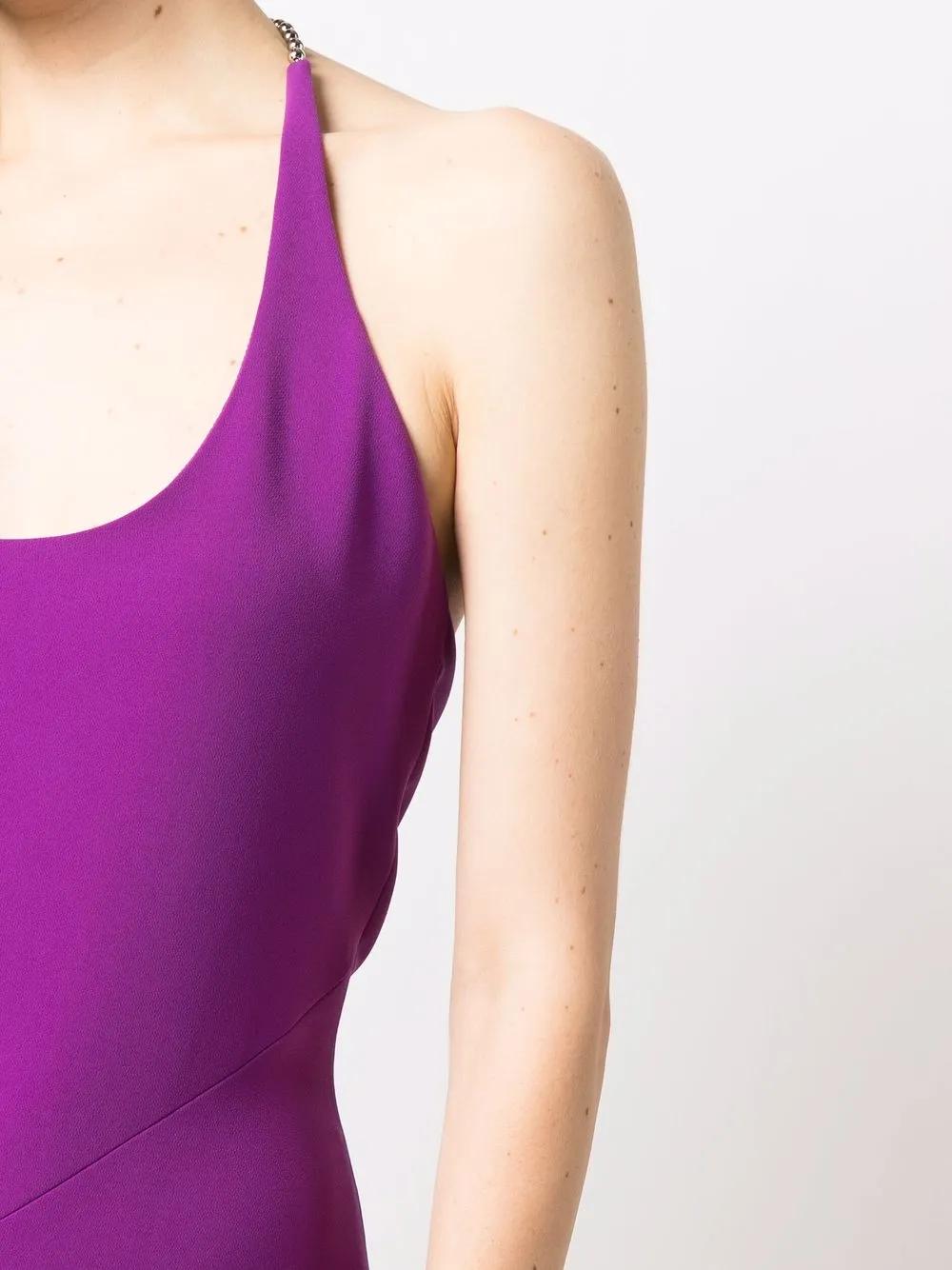 purple wide neck open back bead chain side slit concealed rear zip fastening long length
