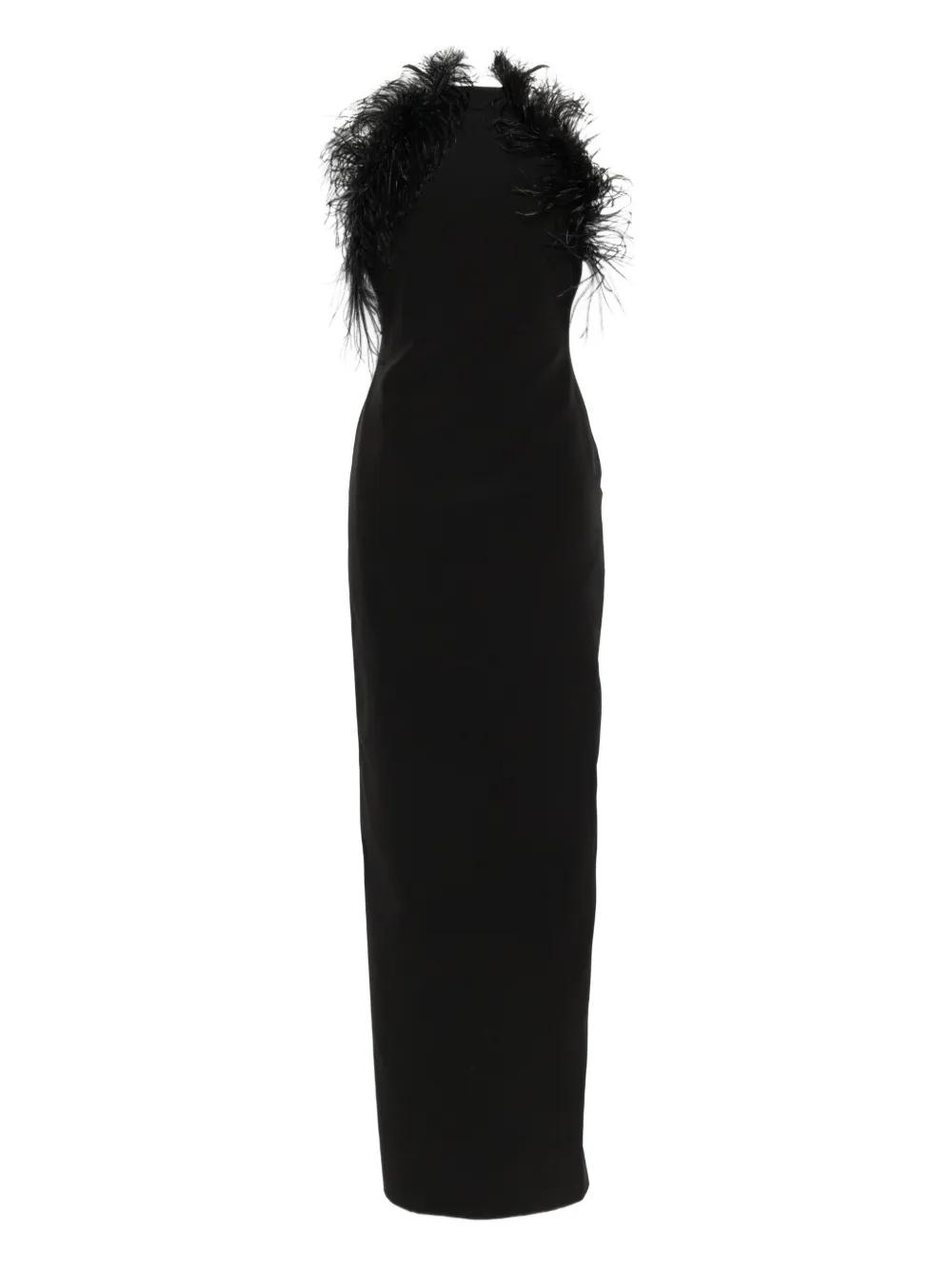 black feather trim sleeveless halterneck concealed zip-fastening This piece comes complete with a protective dust bag.