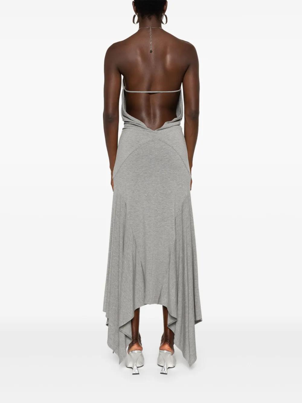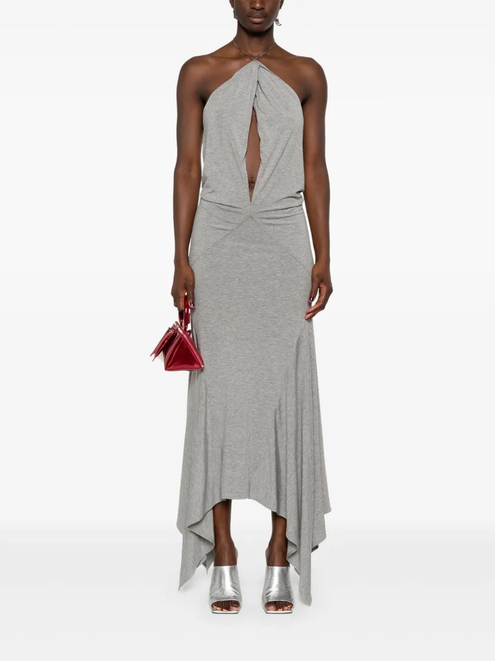 medium grey stretch-jersey mélange effect chain-link detailing mock neck keyhole neck open back A-line skirt handkerchief hem ankle-length