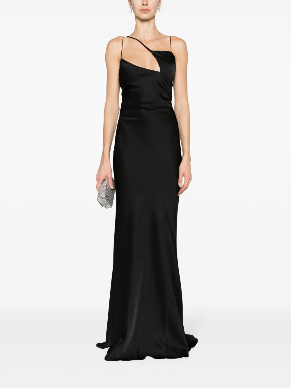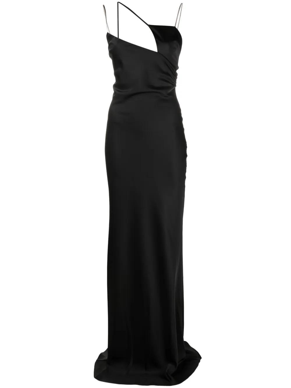 black satin finish cut-out detailing asymmetric neck two chain-link shoulder straps single satin shoulder strap concealed side zip fastening floor-length straight hem