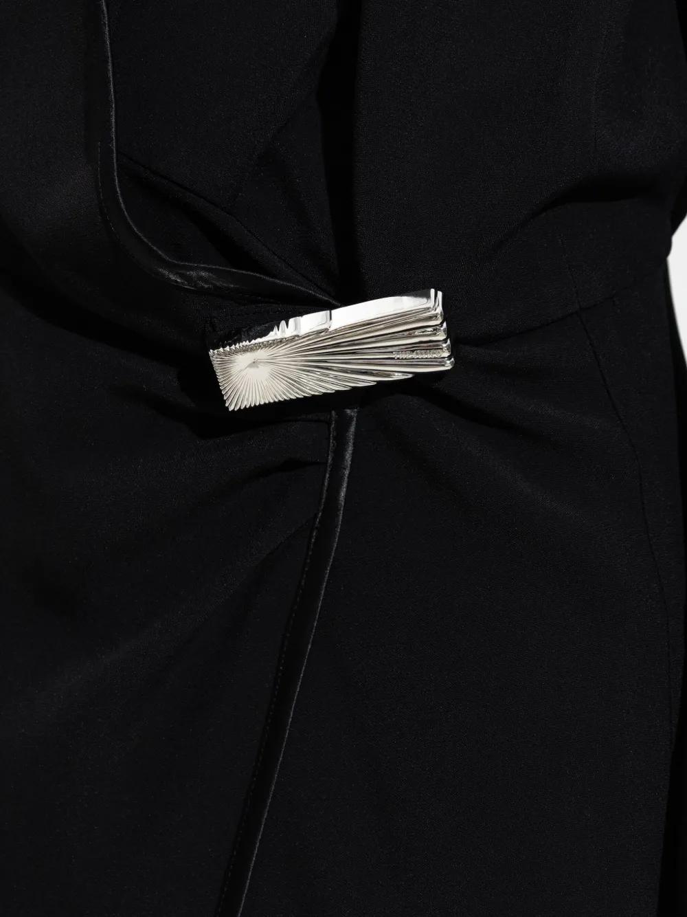 black wrap-front side split long sleeves shirt collar metallic plaque detail