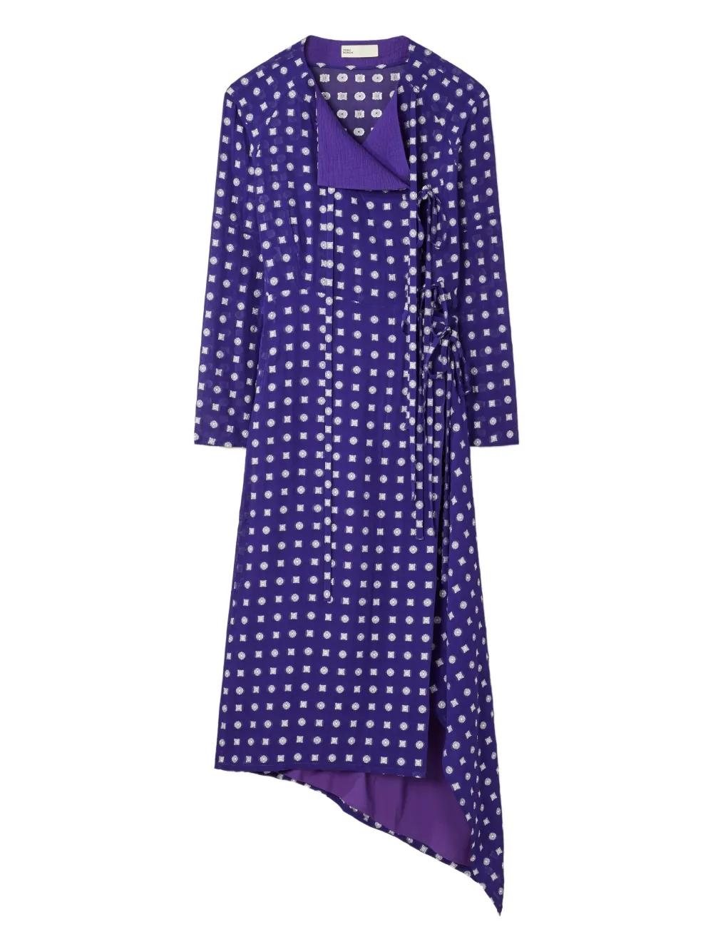 purple wrap design long sleeves asymmetrical hem side cut-out detail cascading drape