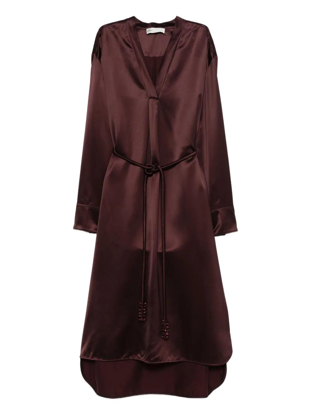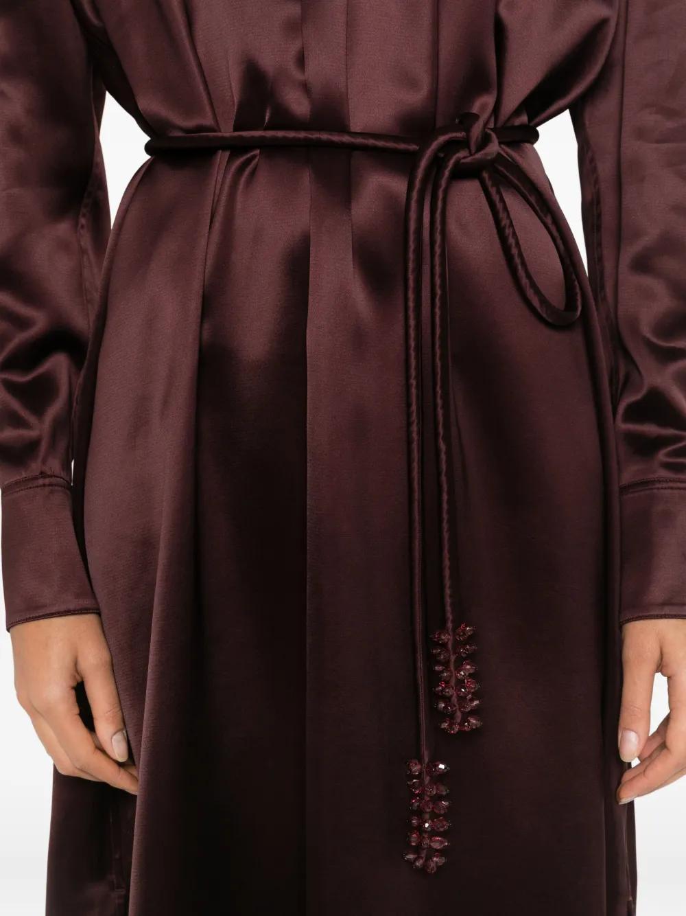 dark red V-neck tie belt long sleeves beaded detail stepped hem