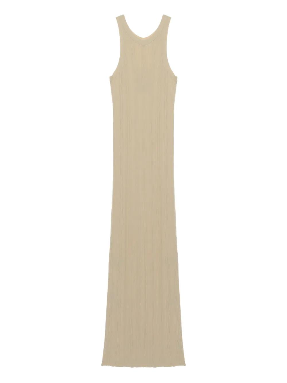 beige ribbed texture sleeveless round neck maxi length straight hem