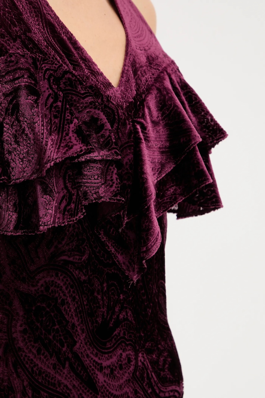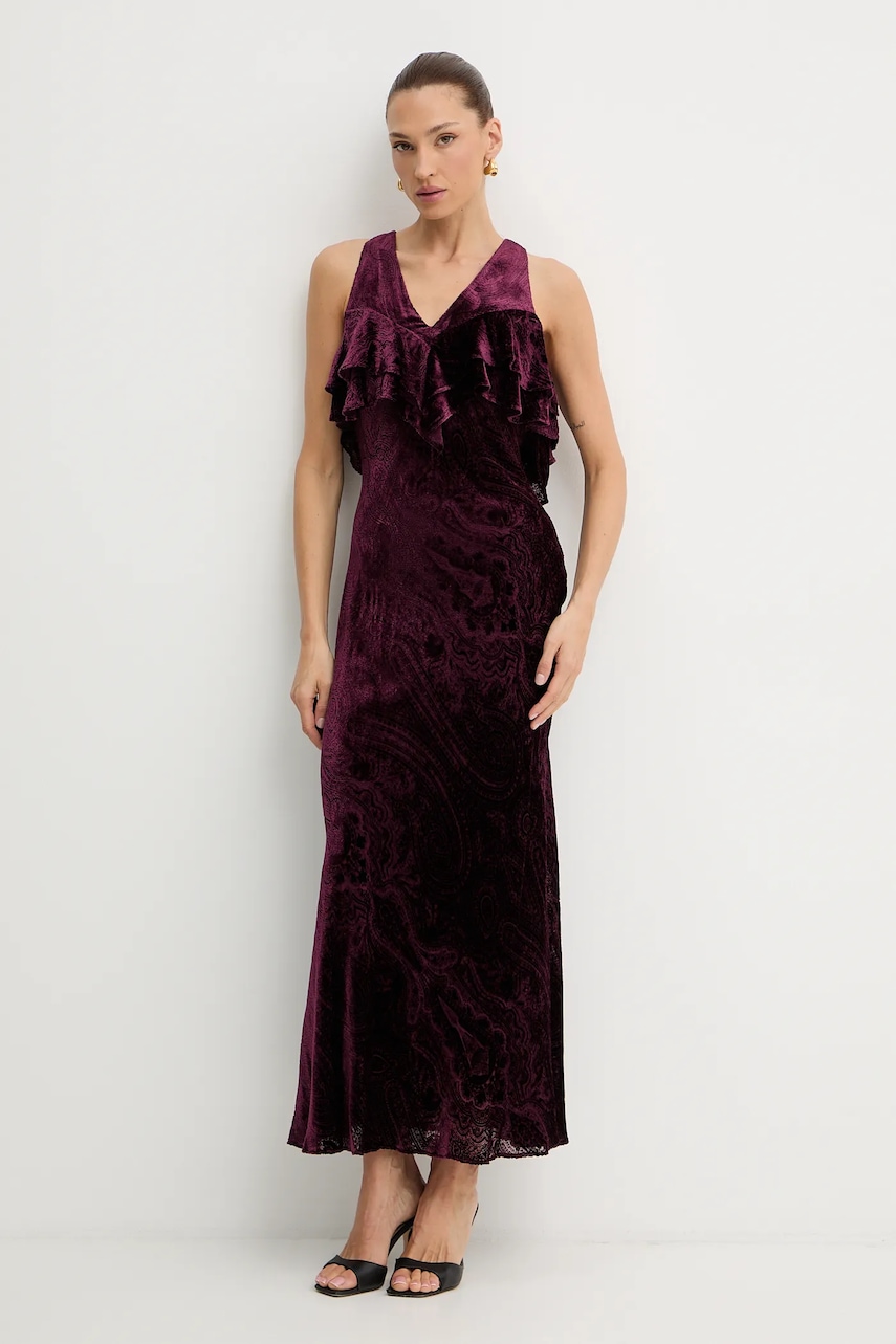 - Dopasowana góra i rozkloszowany dół. - Spiczasty dekolt. - Model z ozdobnymi falbanami. - Boczne zapięcie na kryty suwak i haftkę. - Ozdobne wiązanie z tyłu. - Model na podszewce. - Pokrowiec wykonany z materiału tekstylnego, który stanowi ochronę w trakcie podróży. - Długość sukienki: 147 cm. - Szerokość pod pachami: 50 cm. - Wymiary podane dla rozmiaru: 36.