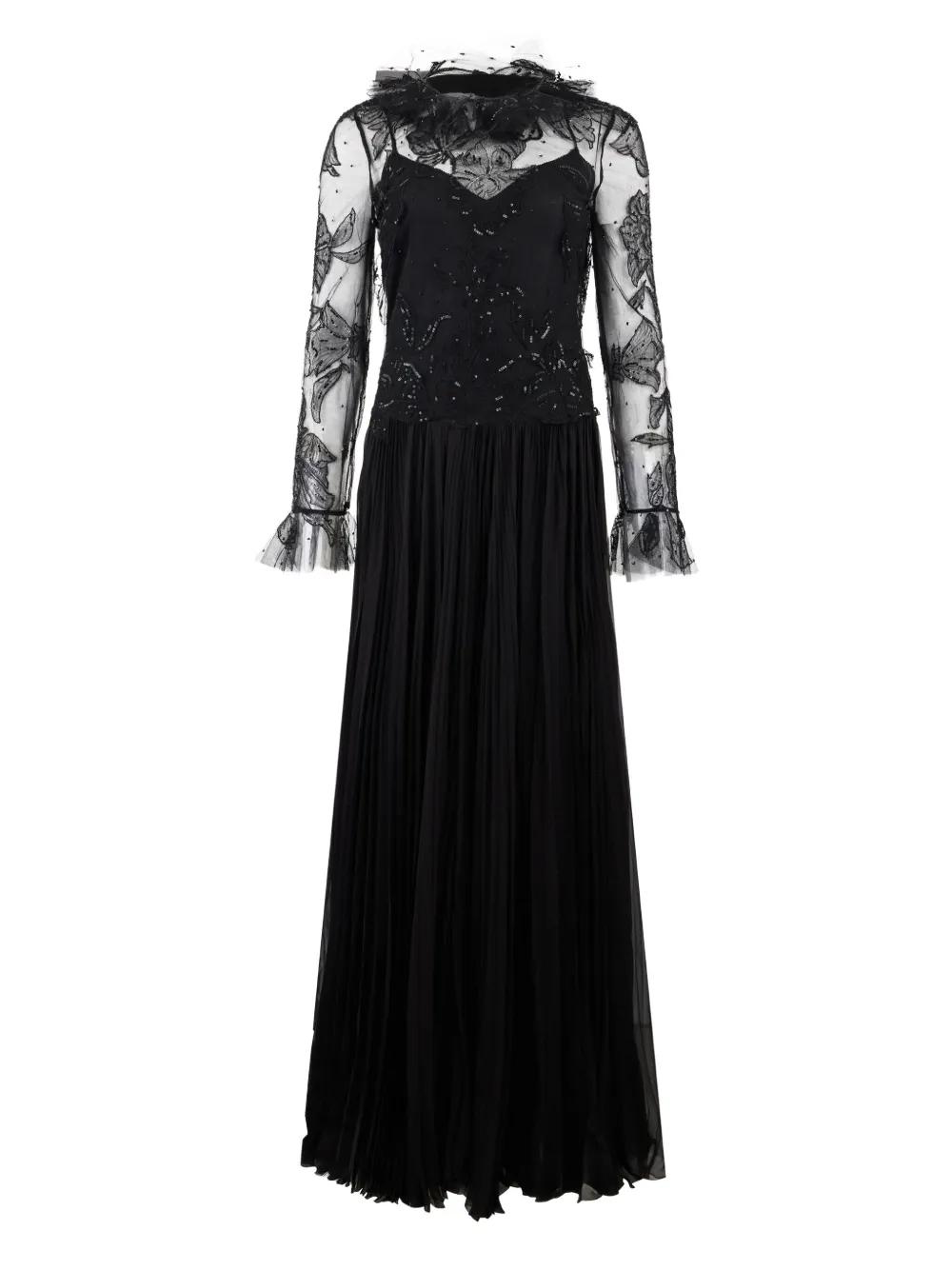black floral detail long sleeves pleated skirt embellished bodice ruffled cuffs