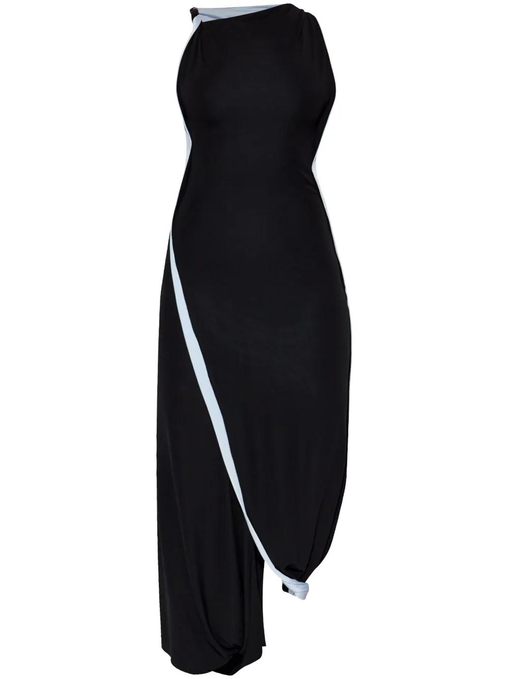 black/blue jersey texture colour-block design concealed side zip fastening asymmetric neck sleeveless twisted shoulder strap cut-out detailing partial lining asymmetric hem long length